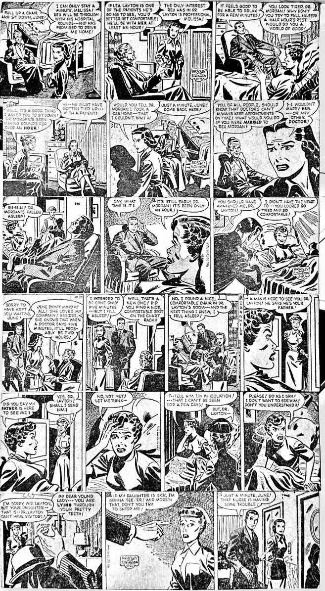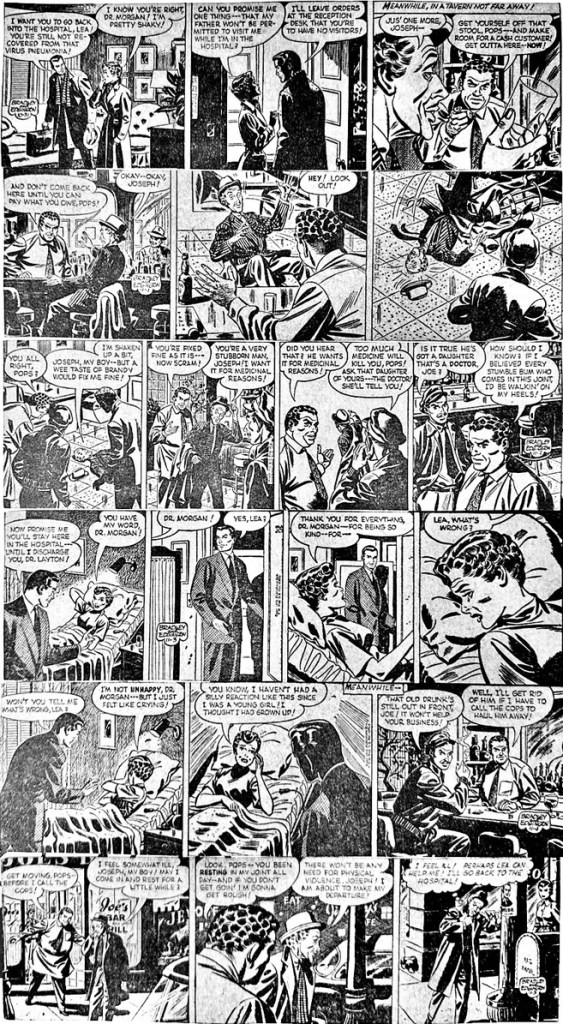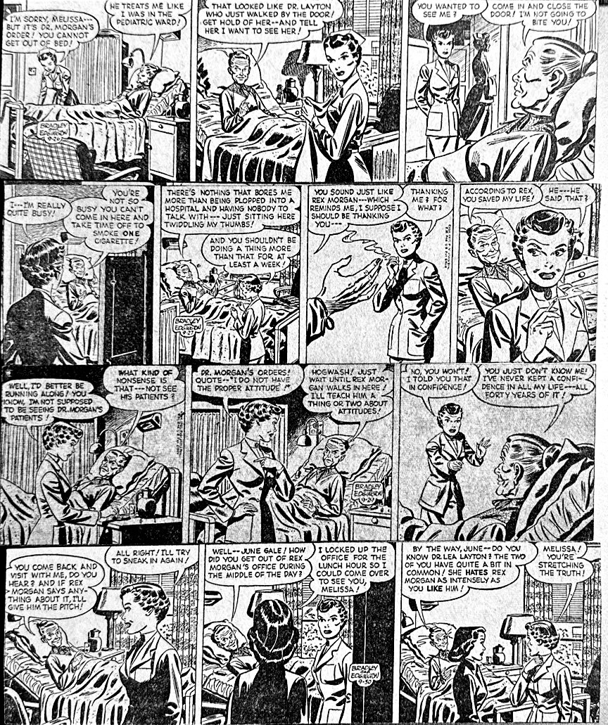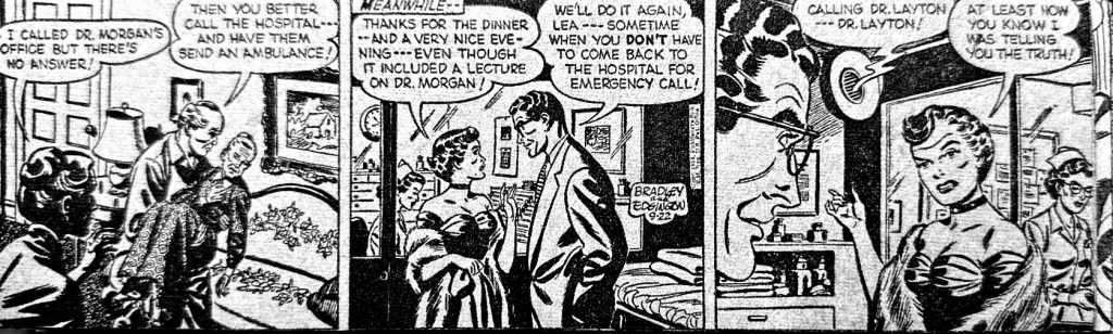 But at its most unwittingly weird, Rex Morgan, M.D. finds ways to meld science and sex. Even as privileged hellion Toni Van Coyne lays back to offer a transfusion it is unclear from her upward glances whether Doc Rex is about to take her blood or just take her. The 50s gender politics of Rex Morgan are pronounced at every turn. Nurse June Gale is of course quietly in love with the doctor, and it proved to be on of the longest lived teases in comics history. Rex and June wouldn’t wed until 1995. But Rex appears to be surrounded by women who are enamored with him in one way or another. The supplicant woman craving Rex’s attention, touch, or validation is one of the strip’s dominant tropes. And throughout much of the 1950s, the strip found many ways to police the borders of acceptable feminine roles and behaviors. A 1955 sequence introduces a medical woman, Dr. Lea Layton, whose professionalism is expressed in a lack of humanity that Rex and the other women of Glenbrook somehow must correct. Predictably, Dr. Layton has daddy issues, an alcoholic father from whom she has estranged herself and in the process from her own emotions.
