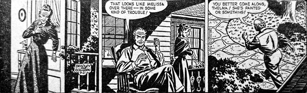 I admit, one thing that does interest me about the soap opera strips is I’m interested in serialized storytelling in general, and specifically the serials that targeted  a stereotypically more female audience—from the 1860s British phenomenon of sensation serials, to American daytime radio and TV soaps.  It’s interesting, in an interview with Mary Worth’s Allen Saunders I found from the 1970s, he says that the slow death of soap strips has a lot to do with the rise in popularity of TV soaps (which in the 1970s for the first time started picking up a young, especially college age, audience) and complained that the syndicate had too many restrictions on storylines they could do—one example he used was apparently being told not to feature a Black woman as the lead in a new storyline.  I wonder about that—while daytime soaps are notoriously slow, still, it’s very different to escape into a 30 minute (and soon, 60 minute) TV program each weekday than to read a three panel (and soon, two panel) comic strip for 15 seconds a day.  However, I do see a similarity now in that the few remaining daytime soaps on US TV are really a shell of what they were at their peak—not just with lower budgets, but also with writing that is less willing to push boundaries (historically soaps were known to tackle subjects, like abortion and gay issues, before primetime American TV would) and a far more rushed production model (due to budget, soap operas now never even have a full dress rehearsal before they shoot.)  Which reminds me in many ways of the current state of the few remaining soap opera comic strips (my grandma was shocked to find out recently that Mary Worth is still running, though it hasn’t been in the paper she reads since the mid 90s.)