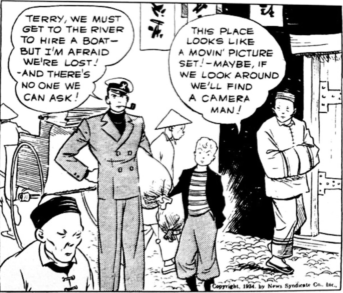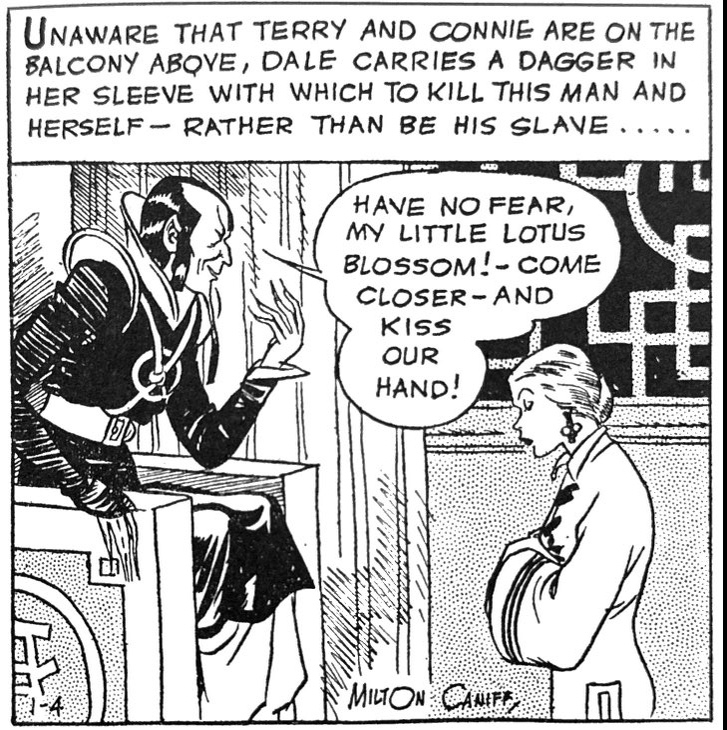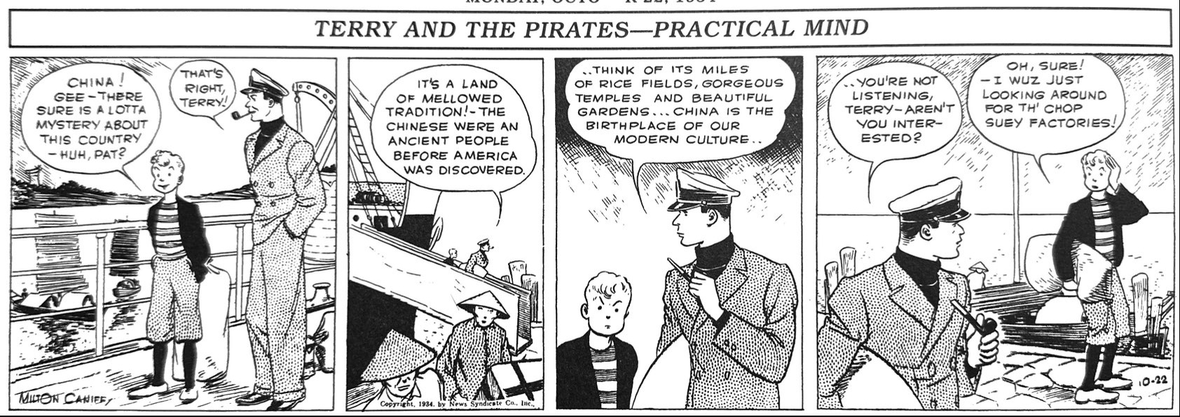 Blasphemous to the canon as it may seem, I find the first year or so of Terry visually and narratively bland. Caniff’s figures were stiff. His thin ink line was inexpressive. The action was unconvincing. And the first stories were boilerplate piracy tales. Terry Lee was more irritating than clever in his unfunny wisecracks. Pat Ryan, while never a particularly engaging character, felt even more two-dimensional than Terry.