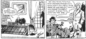 Nearly 90 years ago yesterday Jan. 22 1934, the collaboration between Dashiell Hammett and Alex Raymond launched as Secret Agent X-9. Designed to respond to Dick Tracy’s massive success with the literary cachet of Hammett and the rising talent of Raymond, X-9 looked better on paper perhaps than it did, well, on the actual page. The famous innovator of the hard-boiled style was at the tail end of his productive output and clearly did not give his best effort. After crafting just a few very uneven scenarios, Dash got canned.