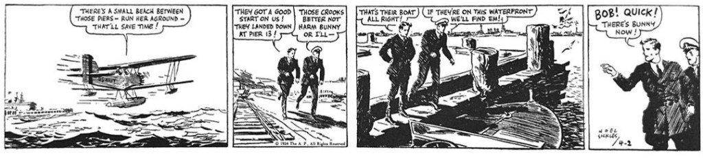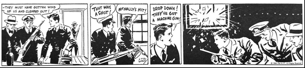 But just a few months into his tenure, by March of 1934, Sickles’ personal imprint and future direction is clear. He seems to be using pulp illustration as a transitional style. The action is more naturalistic and reminiscent of Frank Godwin’s line work in Connie. He is using a lot of straight-lines for shadowing ebbing into larger fields of black and shadow. His panel sequences now propel the action in cinematic ways. He is mixing up his panel sizes and camera perspectives, dramatizing more action and doing more showing than telling in much more economical scripting. And his love of both landscape and machine are becoming pronounced in his aerial ballets.