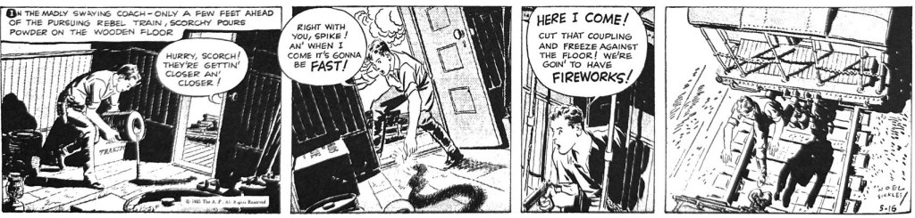 By the end of his run on Scorchy Smith, when he handed it over to assistant Bert Christman on Nov. 23, 1936, Sickles was clearly ahead of any peers, including Caniff, in mapping what a visual adventure comic could do. His influence on the next two decades of comic artists is obvious. Just look at the two strip action sequence below and try not to see Alex Toth. Or another perfectionist – Warren Tufts. His aerial action anticipated George Evans in Aces High. Noel Sickles was surely one of the great shooting stars of comic art – seen briefly but casting a clear long shadow.