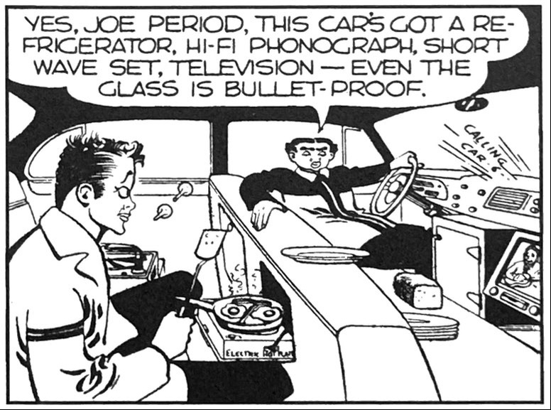 The second and more interesting of Gould’s JD couple is Flattop’s son, Flattop Jones, Jr. While Tracy suspects the young Flattop is “headed in the same direction,” the boy seems to come from a different source. Unlike Joe, Flattop is brilliant, not undirected and hapless. His appearance is more stereotypically teen-like – a white T-shirt and rolled up jeans. And he is a master of 50s car culture. Joe meets him via Flattop’s self-made super car, a tricked-out sedan with built-in TV, police radio, bullet-proof windows, stove-top, sink, safe, and more.