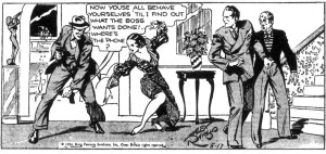 The tableaux panel below (May 17, 1934) is a great example of Raymond’s growing sense of composition, character blocking, and using physical postures to express a range of force, peril, alarm. He freezes the action perfectly to convey multiple layers of feeling, violence and reaction that are so much more complex and evocative than the dialogue alone. This to me exemplifies comics as a singular art, prose and image creating a unique impact.