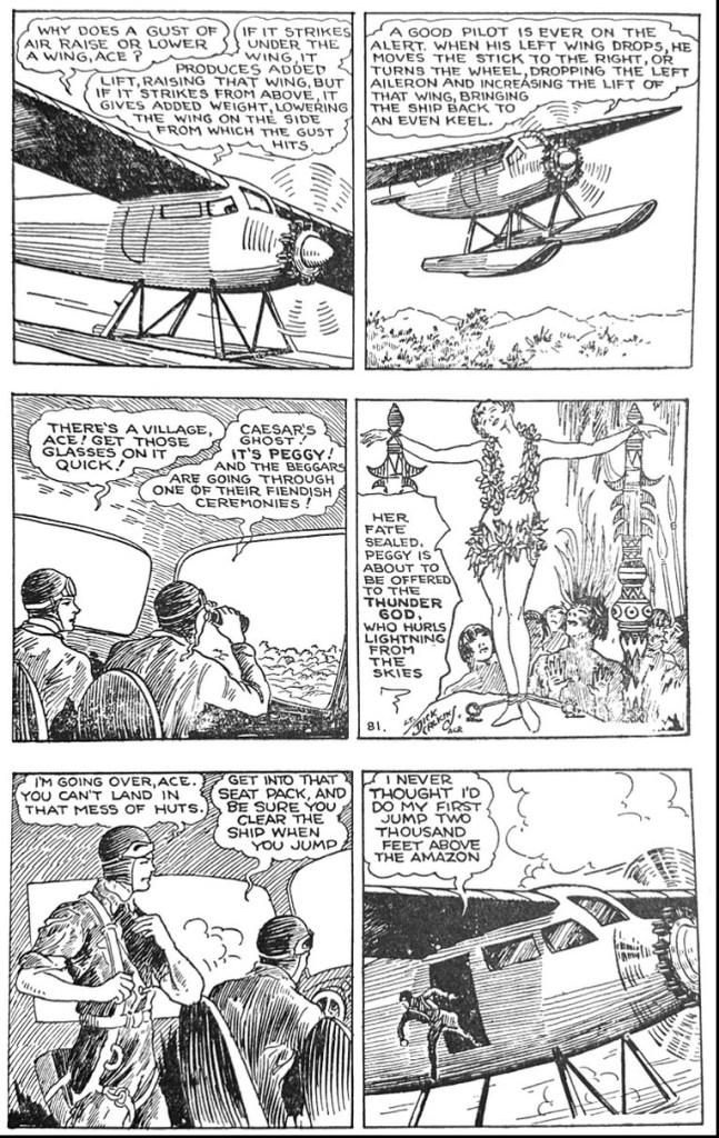 Skyroads was perhaps best consumed as a popular textbook on flight. The dissonance between the pair’s terrible storytelling skills and their love of the tech took unwittingly comic turns. In one sequence from their Amazon adventure, Peggy is fleeing primitive tribesmen on the ground, even offered up for sacrifice to their gods, while the strip cuts over to Ace and Buck chatting about the minutiae of flight dynamics.