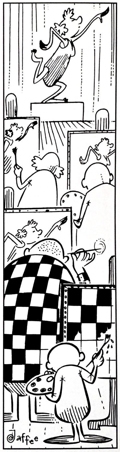With the sad passing of Al Jaffee this week, cartooning lost its oldest and longest-working artist. In fact, the man behind 55 years of MAD magazine Fold-Ins held the Guinness Book of World Record for having the longest career in the field. But his 1964 invention of that classic foldable end-page gag was not his first stab at rethinking form. His inspiration for the fold-in was an inversions of the then-trendy magazine fold-out. But it turns out that zigging when others zagged was a bit of a thing with Jaffee. Back in the mid-1950s he broke into the syndicated newspaper comic strip market by literally turning convention on its side. He called them Tall Tales.