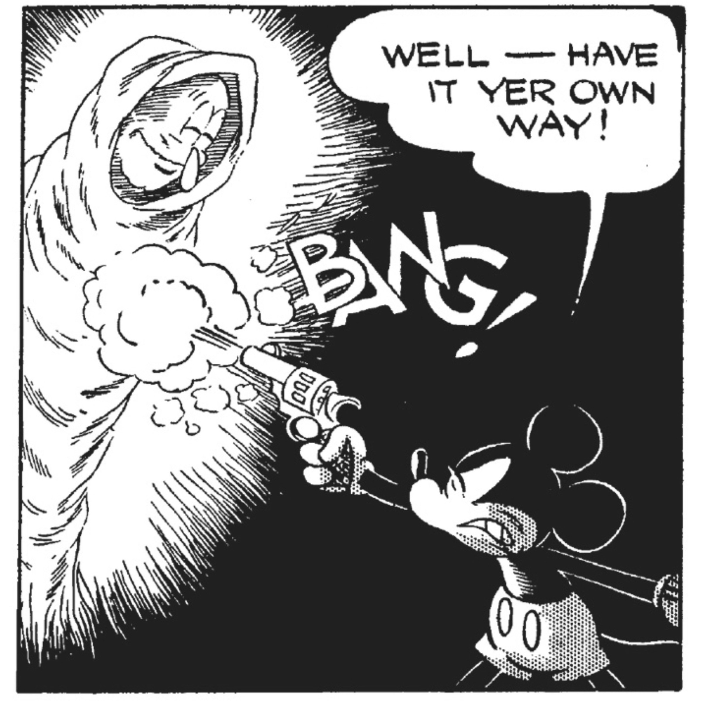 Before becoming the anodyne logo of Disney’s saccharine-soaked family image during the post-WWII era, Disney’s Mickey Mouse had some heroic chops. Make no mistake, Mickey was never even remotely “edgy” let alone hard-boiled in the style of some other 30s pulp protagonists. But he was imagined by Disney in the original animated shorts and then by Floyd Gottfredson in the daily comic strips, as a spunky, resourceful adventurer. In the 1930s, Mickey was thrust into a number of roles and across all of the pop culture genres: sky jockey, detective, western outlaw hunter, ghost-hunter, even sci-fi adventurer. As tame as Mickey’s 30s adventures may seem, the Disney corporation in its most controlling moments in the past has tried to disappear come of the earliest imagery of their corporate logo packing a gun or interacting with some cringe-worth but commonplace racial stereotyping of the era.
