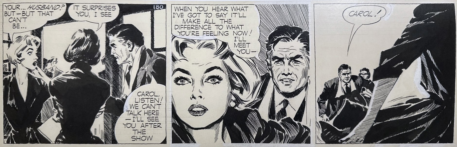 This background in aspirational magazine art deeply informed both the setting and style of his Carol Day strip. Financed by a wealthy benefactor after her parents’ death, Carol breaks free to find her path in mid 1950s London. She soon enters the rarified air of the modeling and fashion world, and the strip remained entrenched in a well-heeled, stylish, professional upper-middle class setting. Wright’s art style had been hewn depicting this world. He applied a realist style that owed much to Alex Raymond’s Rip Kirby, which he admired, and the post WWII photo-realists like John Cullen Murphy (Big Ben Bolt), Leonard Star (On Stage) and Stan Drake (The Heart of Juliet Jones).