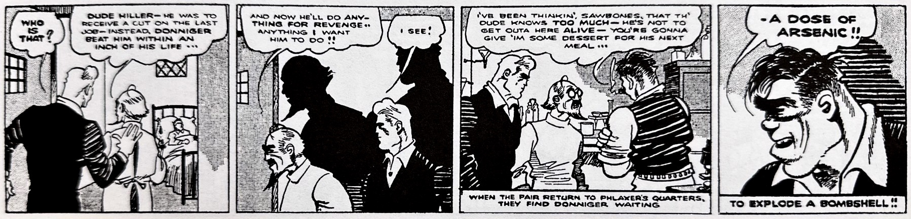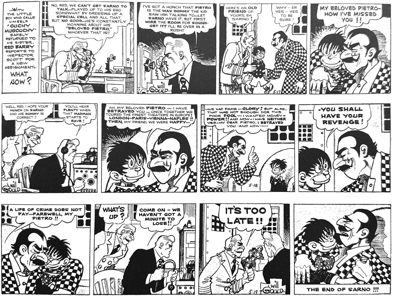 Red Barry’s plots and cast of characters were often crowded and twisted. Operating under deep cover, Red’s true identity and purpose were known mainly to Inspector Scott (Scotty) and an improbably vast, widening network of friends and helpers. He had his own Junior Tracy in the orphaned Ouchy Mugouchy, who would dominate the final year of the strip with his boy gang of crimefighters, The Terrible Three.