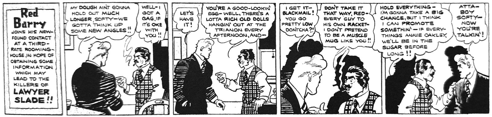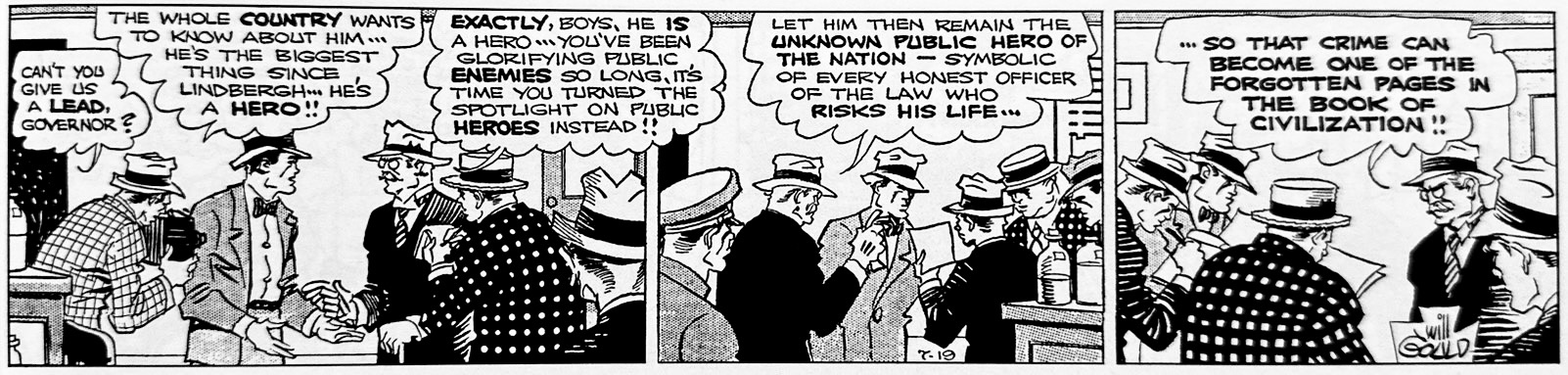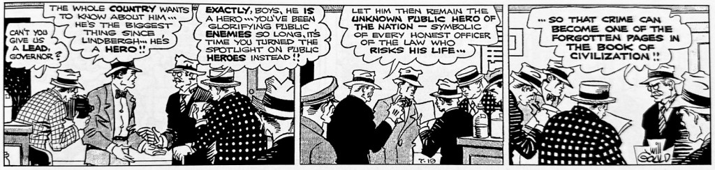 Red Barry separated itself from a growing field of 1930s crime comics, which included X-9, Radio Patrol (also from King), Dan Dunn, Jim Hardy and many lessers. Most of all, Gould truly crafted an immersive underworld feel to the strip. This strip was less about crime than it was about a culture of crime. The stories themselves deliberately echoed headline news, from gang wars and blackmail rings to innocent bystanders caught in criminal crossfire. One of his preening, self-important gangsters, Bull Donninger was a thinly veiled iteration of celebrity thug John Dillinger. Many of the plots involve multiple city gangs where their rivalries and internal power politics become part of the central mystery.