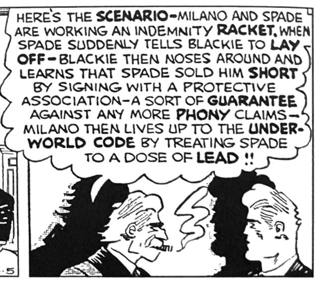 Comics historians like to cite Gould as one of the innovators in lettering, as he used bolded words to give his speech balloons a special emphasis and cadence. It was one of the ways that the comics medium could distinguish itself from text-bound media, by blending the visual and the verbal to unique aesthetic effect. As important to the tone of the strip was the language itself. Gould’s characters exchanged hard-boiled lingo with the velocity of machine gun fire. Hammett’s Continental Op and the patois of 30s gangster films couldn’t hold a candle to Gould’s dialogue, which was a lexicon of relentless figurative references and urban criminal metaphors. Some of the tough guy lingo is familiar – guns = “heaters” etc. But professional boxers (“pugs” don’t box but “push leather.” People don’t see one another so much as “lamp” them. Pickpockets are “Poke-lifters.” Priests are “sky pilots.” iAnd again, the dialogue of Red Barry imagined a true culture of crime with its own language that preferred talking in colorful codes.
