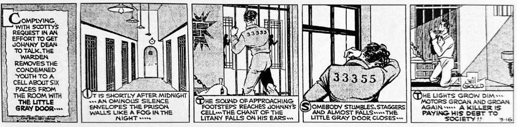 Gould’s psychological sensitivity led to genuine pathos. Following the template of American male heroism, Red’s masculine bravado has a purpose, staring down (sometimes literally) the ego-driven gangsters. But unlike the villain, his violence is principled and tempered by sentimentality that seems to balance, even justify his love of force. His paternal devotion and love for his virtual son Ouchy is worn on his sleeve. And Gould himself showed a fair emotional range. One of the most aesthetically and dramatic sequences in the strip’s short history brought us into the heart-rending torture of the prison death house. Racing against the doom clock of a wrongful execution, Gould spends weeks depicting the final hours of a prisoner’s impending death. Gould is at the height of his graphic power here. The taunts of fellow inmates, the looming, ever-present door to the electric chair, the pain of watching others march to their doom – are rendered in excruciating detail.
