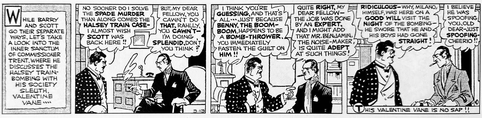 Will Gould was temperamentally the opposite. As his assistant Walter Frehm recalled, only eleventh-hour deadlines could pull Gould off the golf course or out of the Hollywood Brown Derby nightclub to do 48-hour crunch sessions at the drawing board. As time went on the art looked as rushed as it was. Frehm followed Gould to the golf course and out clubbing, notebook in hand to record the story lines that were cooked up on the fly. But this anti-Gould artist also created a worldview that was just as different from Dick Tracy and most other crime comics as one could imagine. It had whimsy, depth, a genuine vision of 30s era underworlds and their connection to everyday America. He was even a bit churlish. As if to compare his own strip and his hero to the range of other mystery and crime fiction of the thirties, he lampooned the effete detective Philo Vance, S.S. Van Dine’s amateur detective of novels and film. The ever clueless Police Commissioner Trent keeps the “society sleuth Valentine Vane” busy pursuing parallel, usually fruitless, investigations of the crimes Red eventually solves with his two-fisted, hard-boiled undercover approach. Like Dashiell Hammett, Gould was self-consciously rejecting the polite, cozy mystery whodunnit mystery genre that Van Dine and others imported from British pop lit. More deliberately certainly than Chester Gould, will Gould was asserting an american, hard-boiled approach to crime writing.
