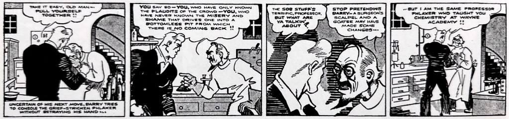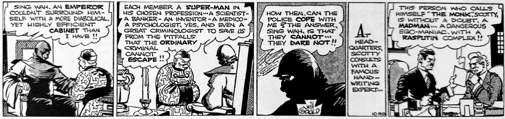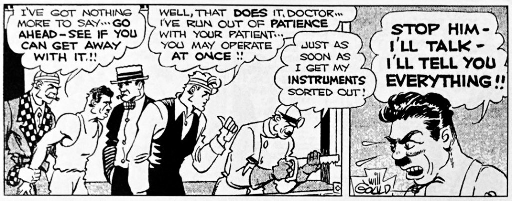 Which is to say that Gould brought to the Red Barry strip a psychological approach to character that was much closer to Milton Caniff in Terry and the Pirates or Tuthill’s The Bungle Family than it was to other crime comics. The egotism of the tough guy and its underlying insecurity is embedded in the banter and the action. Gangsters aren’t just beaten; they are humiliated or in some way emasculated. One of Gould’s early celebrity baddies, Donninger, is a headline-hungry, vainglorious poser, personality flaws that Red uses to his advantage. A more pulpish super-villain “The Montk” is a mastermind who is literally diagnosed by a handwriting expert as a “dangerous ego-maniac with a Rasputin complex.” Chester Gould’s grotesque villains usually stand outside humanity both physically and morally. Will Gould’s vision of criminality is usually a warped extension of humanness.