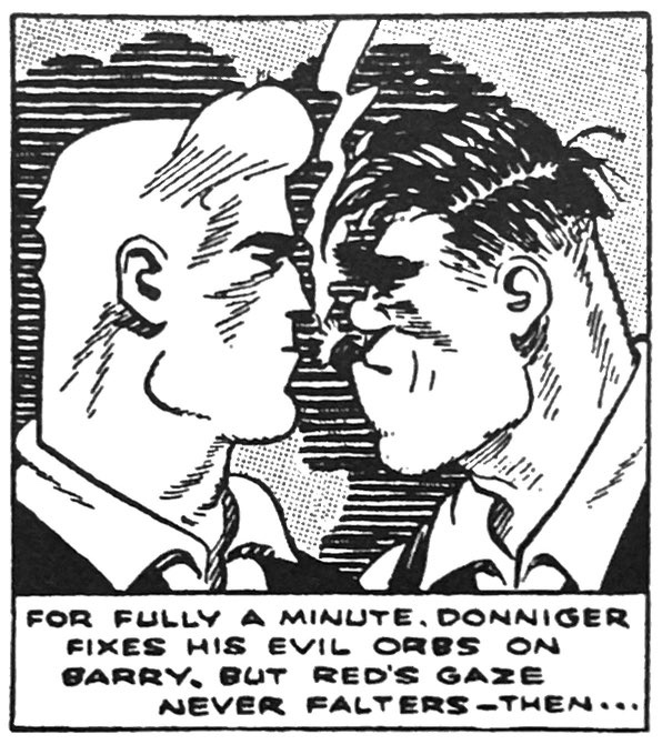 In 1933, Gould was among the many newspaper artists who vied to draw King Features’ plan to compete with Dick Tracy’s success by throwing at it the legendary crime novelist Dashiell Hammett. Hoping that King and its President Joseph V. Connolly would ride the crime comics wave with more than one entry, Gould also submitted spec strips for Red. Drawing from his own acquaintance with prosecutors, seedy characters and crime coverage, Gould imagined Barry as a former football star turned undercover cop who penetrated gangland.