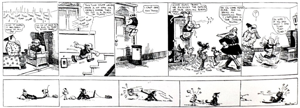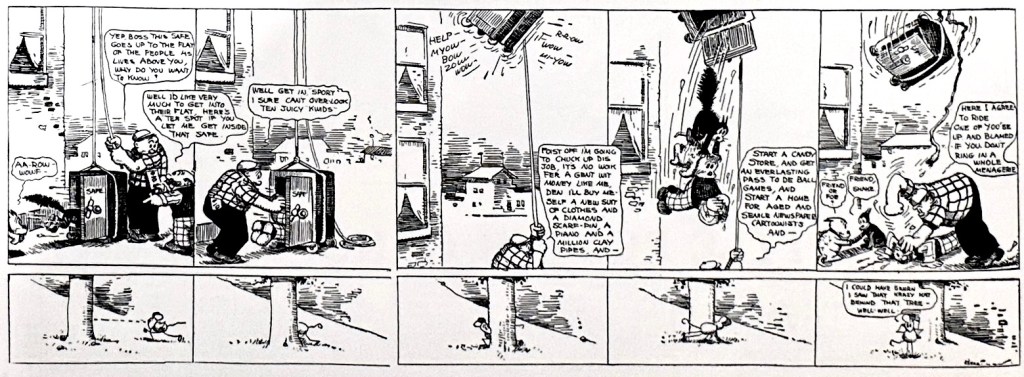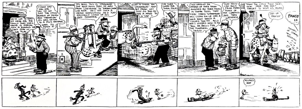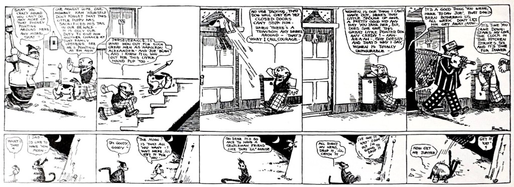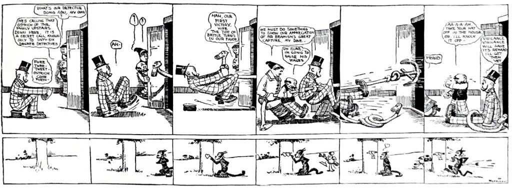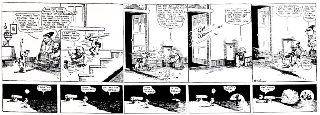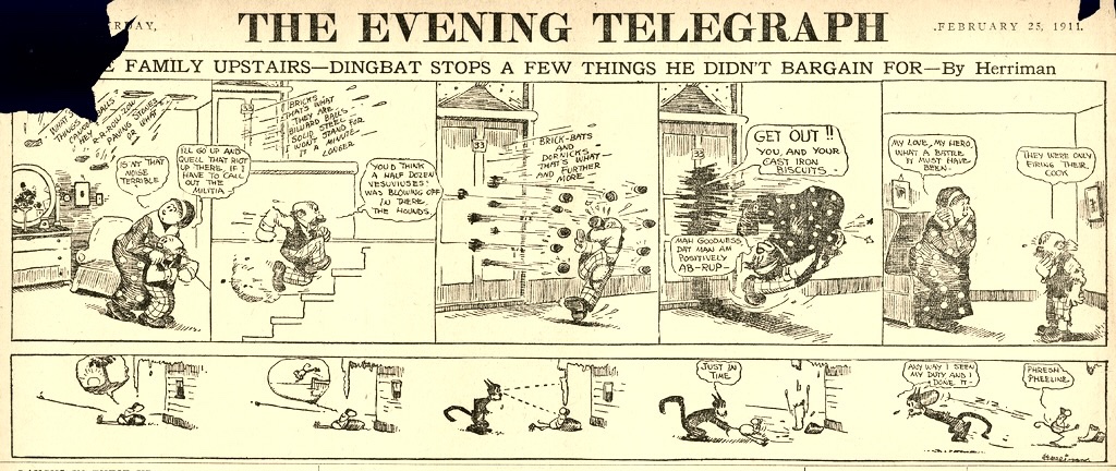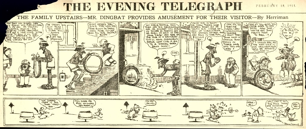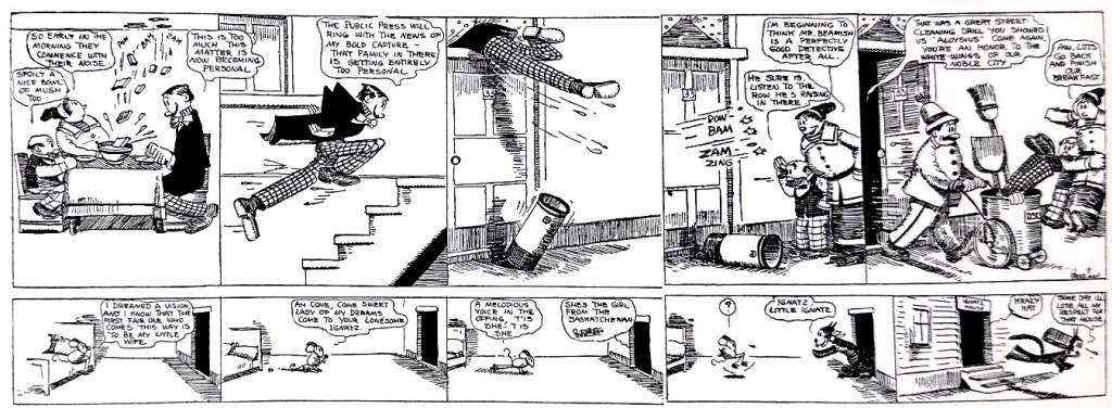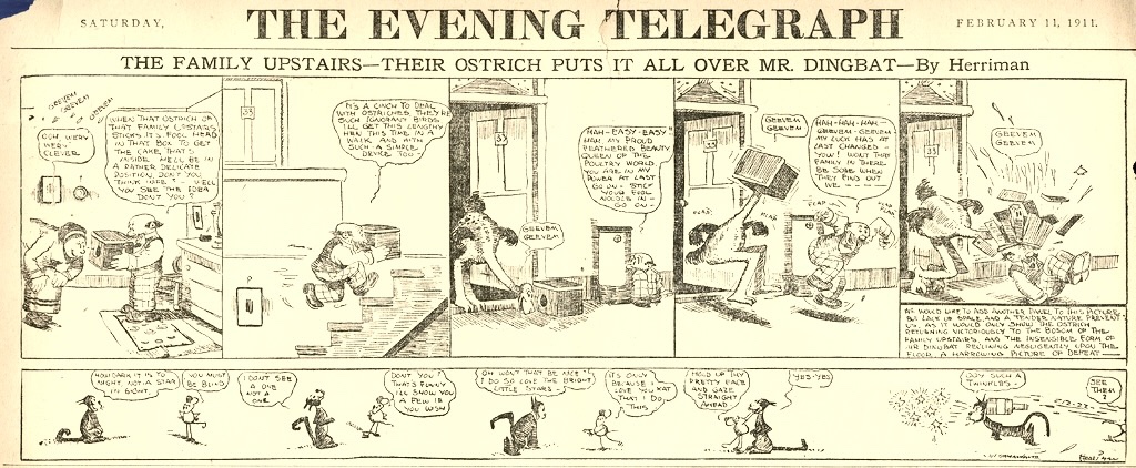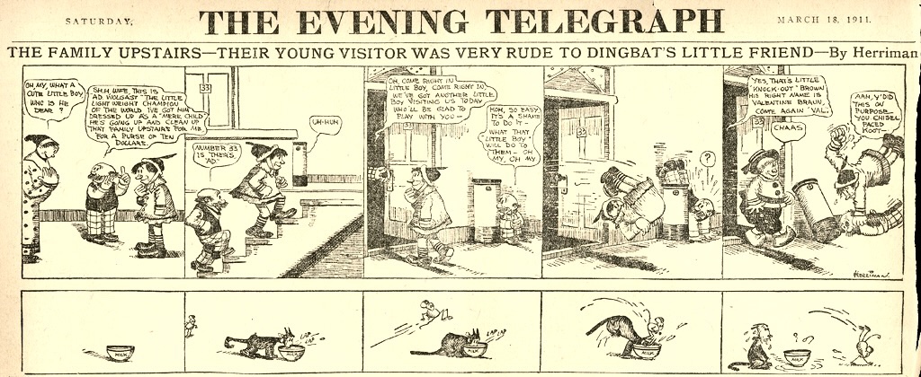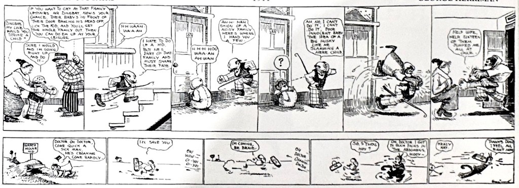 On occasion, Herriman enjoyed inverting Krazy and Ignatz’s bottom tier with the Dingbats above.