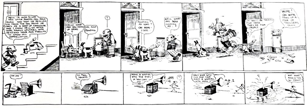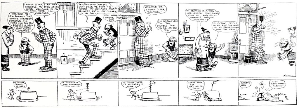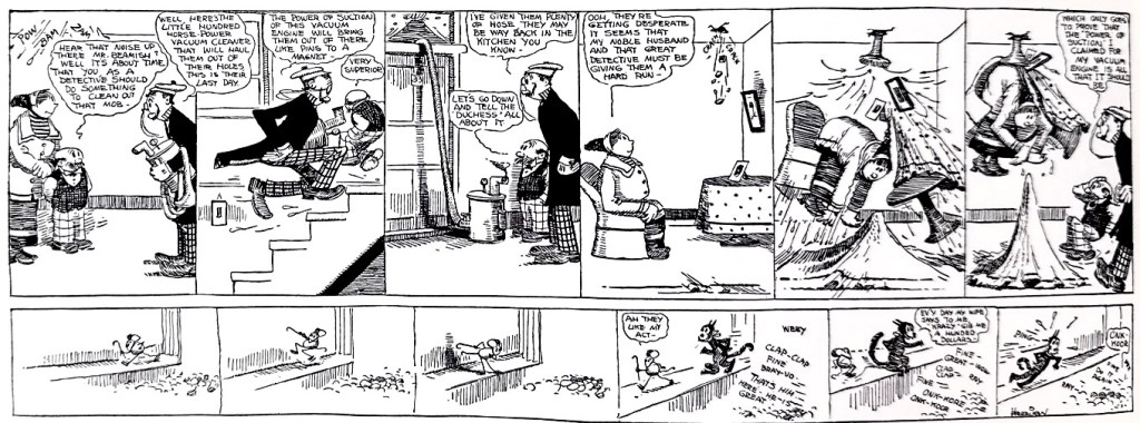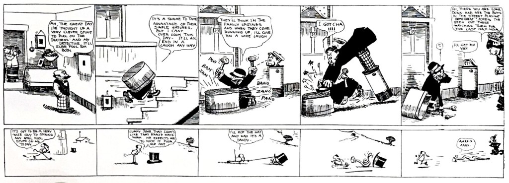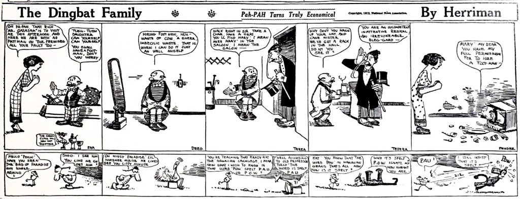 While he didn’t dwell on the domestic comedy tropes that Sterret, McManus and Sydney Smith would make central tot he sitcom, Herriman foreshadowed some of them. Like decades of sitcom children, the younger Dingbats aspire beyond their station, which prompt familiar gags around social class, schemes to deceive. In the strip below Pa poses as a footman to help his daughter impress a snooty suitor.