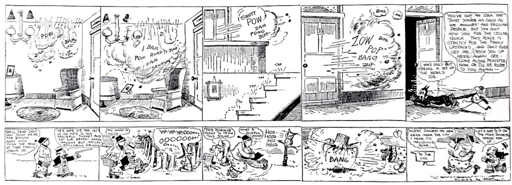 The shrunken American male was always at the center of the modern family sitcom, and at the head of that long line of hapless hubbies is George Herriman’s pint-sized E. Pluribus Dingbat. The Dingbat Family premiered in June 1910, but was soon retitled The Family Upstairs when by the next month E. Pluribus had found his persistent nemesis, the noisy upstairs neighbors. When the strip is studied at all, it as the birthplace of Herriman’s more famous Krazy and Ignatz. Kat and mouse started as a secondary pantomime comedy at the bottom of the Dingbats, first seen on the same day the Dingbats discovered the irksome “family upstairs,” July 16, 1910 (see above). According to Herriman biogrpaher Michael Tisserand, the artist quickly fell in love with the Krazy and Ignatz dynamic, was able to spin the duo off into their own strip and make history. Herriman himself was unsure of the appeal of the Dingbats, even though his bosses at Hearst seemed to compel him to continue the series for six years. His heart belonged to Krazy. Still, in E Plurubus Dingbat Herriman was laying down some of the early tropes of the family sitcom. The diminished and dimuntive father figure had comic precedents, namely Jeff of Mutt and Jeff, Gus Mager’d Henpecko, and to a lesser extent the lesser half of George McManus’ The Newlyweds. But it is in The Dingbats that we start seeing the sitcom dad adopt his fuller cultural role. Haplessly raging against a modernizing world, bemoaning his own diminished authority, battling stylish children, neighbors, politicians, plumbers and garbagemen, half-baking schemes that always fail, much of sitcom fatherhood take shape in Pa Dingbat.