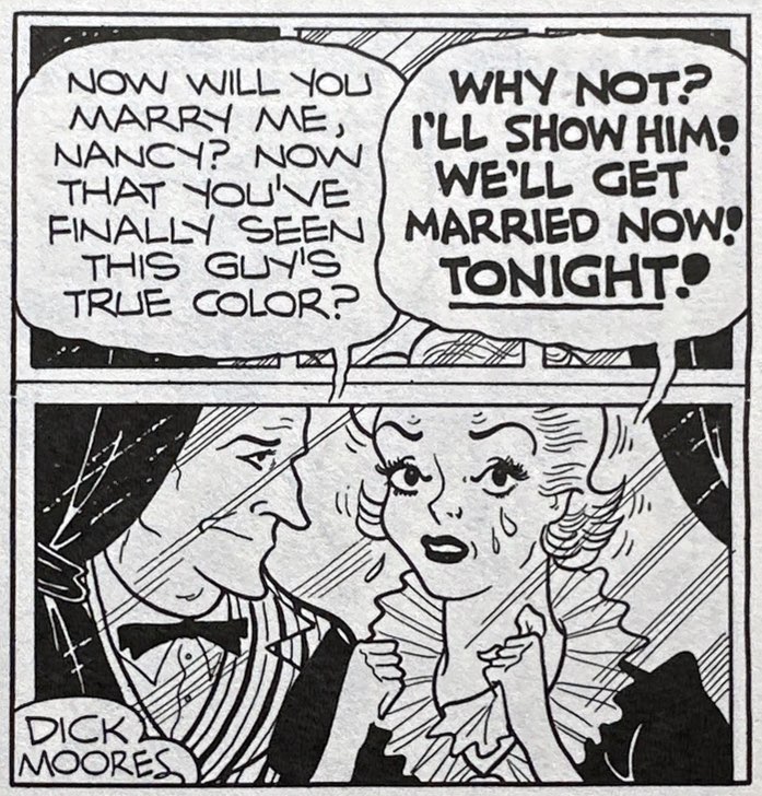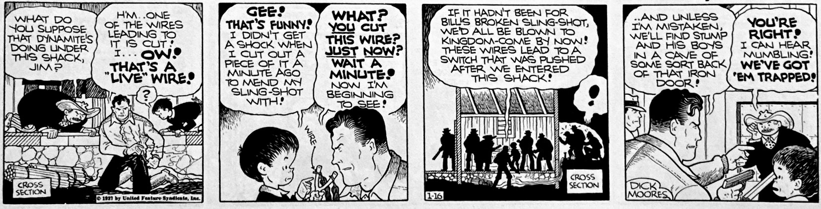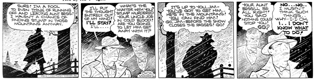 Moores was clearly searching in Jim Hardy, for a style of his own as well as a character and firm career path for Jim. His storylines were often improbable and sprawling, feeling even more improvisational than Gould’s. The story that begins with Stump’s big swindle of Westburg becomes a chase that brings him into the snowy tundra, a criminal enclave, a ghost town, back to Westburg and a lengthy romantic misadventure, a false marriage for Nancy and multiple near-death escapes. And throughout Moores tosses in a massive cast of sharp and feckless lawmen, robbers, conniving and sympathetic damsels. The ride is at once rambling but still engaging. It is as if we are involved in Moores’ and Jim’s own journey to discover what this strip really is about.