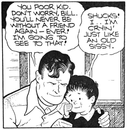 Jim Hardy is interesting because it tells us something about the uniqueness of the comic strip form. For all of its institutional constraints, this was among the most personal of modern mass media. The major electronic media that defined the twentieth century – newspapers, film, radio, television – were so collaborative critics often struggle to find in them some “auteur”, some way of aligning modern mass art with classic literature, art and music. But the comic strip is the product of a singular vision. Its world is established so fully by a distinct visual voice, its own cadence and tightly controlled point of view, illustration of character through unique line weight and even its own physics. It feels intimate, like a direct engagement with an individual imagination. At its best, the comic strip can involve us in ways closer to poetry or painting. By any critical measure, Dick Moores’ Jim Hardy was an unsuccessful, short-lived effort by a nascent talent. But its art, character arc and and humanity are anything but forgettable.
