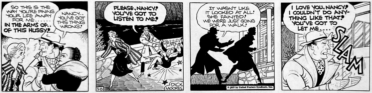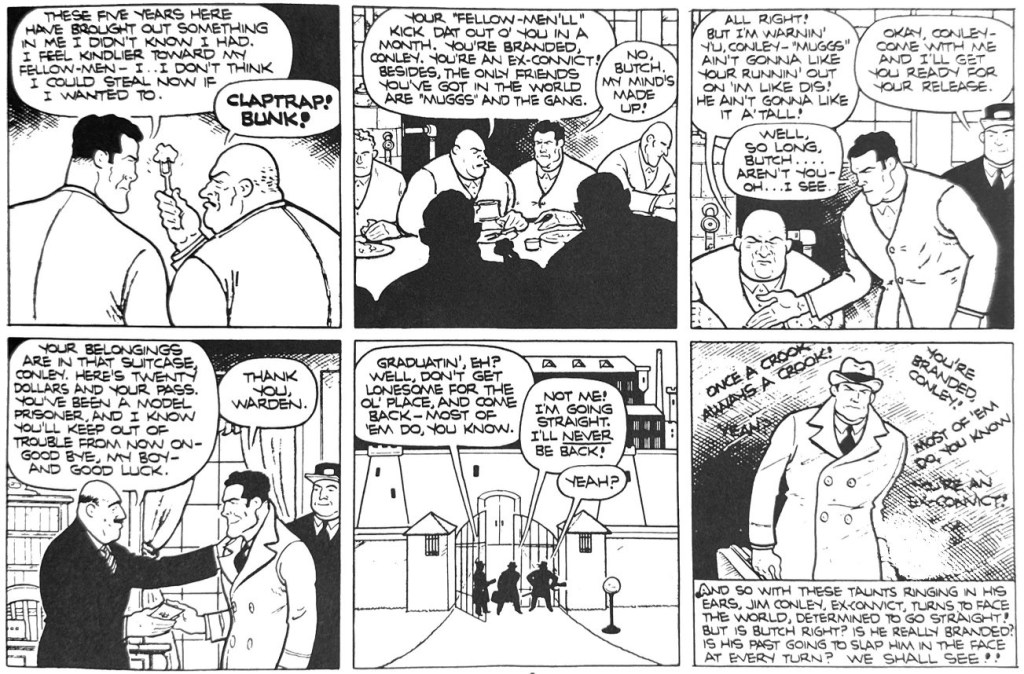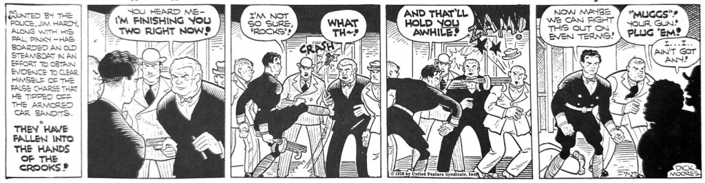 Unlike Chester Gould’s steadfast and stoic Dick, Moore endowed Jim and the strip with considerably more sentiment and even psychological dimension. This is a hero with a lot of heart. His devotion to the young Bill is closer to the surface. Hugging is allowed here. Likewise his courting of Nancy is genuinely romantic and itself becomes a lengthy storyline involving intrigue, rivalries, tearful moments (even from our hero) and more than a little kissing. Hardy was righteous, to be sure. But Moores was breaking free from the stoic, unforgiving moralism of Gould’s world view. The strip is as sentimental as it is action-packed. Jim is a two-fisted he-man in the crime fighter mold, but he also experiences self-doubt, genuine heartbreak, and moral uncertainty. In one of Moore’s best attempts to visualize his hero’s inner turmoil, the introspective Jim is followed by a ghost-like conscience that embodies his two minds. And while Moores later criticized the strip’s lack of focus, Jim’s nomadic, journeyman existence surely channeled the American ethos of the 1930s. Persistently dislocated, looking for his place and a path up from hard luck but righteous and strong, Jim embodied qualities FDR may hav had in mind in referring to the “Forgotten Man” his New Deal was designed to help.