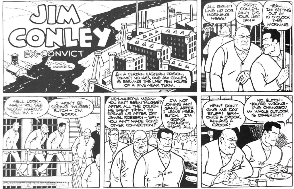Moores had been struggling for years to move out of Gould’s shadow with a strip of his own. United Features finally took up one of his many proposals, a hard-boiled tale of ex-convict Jim Conley who was trying to break from his own gangster past. Newspapers rejected the idea of an heroic ex-con, so Moores and the syndicate retooled the strip as Jim Hardy: Man Against the World. In this reimagining, Jim is down on his luck when an old friend-turned gangster tries to lure him into a life of crime. In the process, Jim is mistaken by authorities as a gang member but ultimately proves his heroism by infiltrating and thwarting the criminal mastermind’s plans. By Moores’ own admission, the problem with Jim Hardy was that his author never decided who he wanted his hero to be. He journeys through various careers and settings, but usually lands as a reporter who worked in parallel and in tandem with the law to unwind a range of villains.