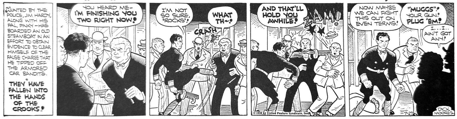 Ultimately, Jim Hardy fails because Moores’ himself didn’t seem that interested in the crime adventure genre. He had no clear vision of what crime was. Chester Gould had a firm sense of metaphysical evil to animate his strip. Will Gould’s Red Barry had its own grasp on a complex, inevitable urban underworld. Even the more procedural Radio Patrol drew from its journalist authors’ familiarity with tales of criminal greed and corruption. Moores was so loosely attached to the crime genre that Jim Hardy eventually morphed into a strip about a cowboy named Windy and the racehorse Paddles, for whom the strip was retitled before its demise in 1942.
