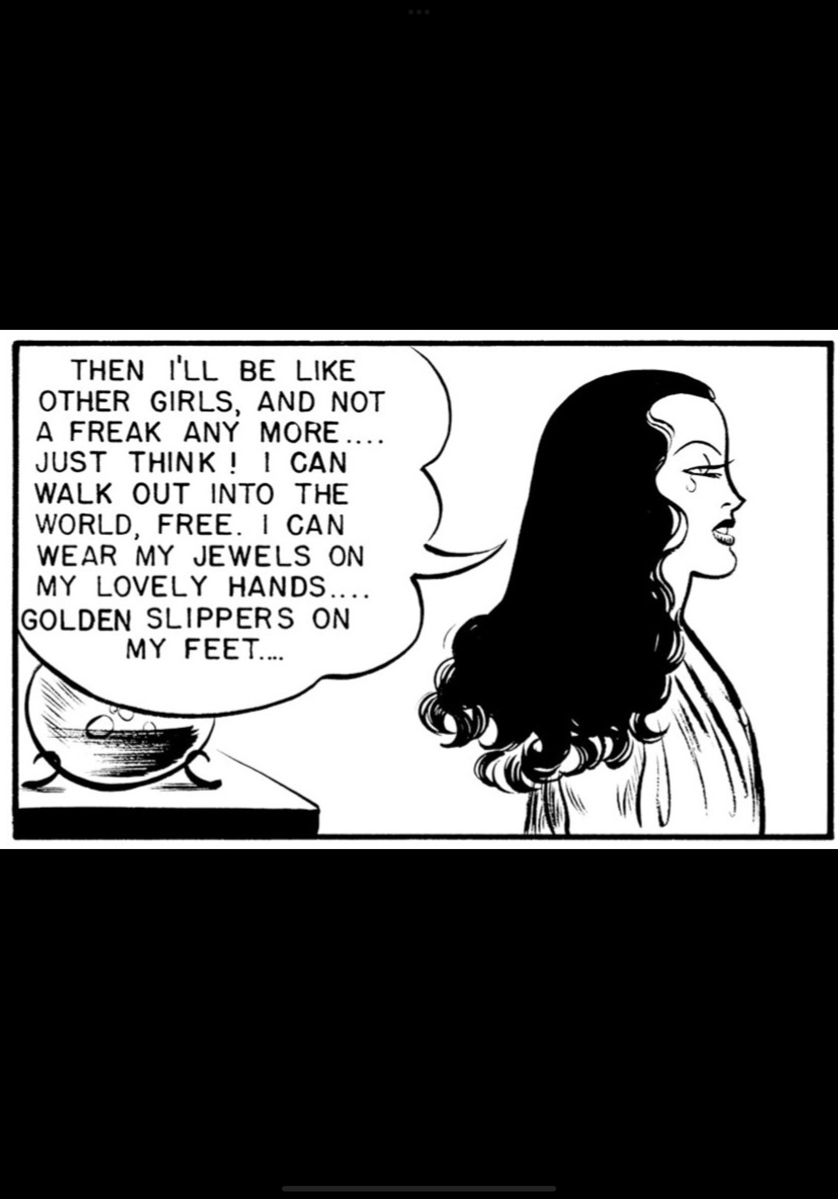 However pioneering Brenda’s careerism may have been, it would be a mistake to see Messick as a prescient feminist radical. Brenda’s heroism was still entrapped in cultural convention. A glamorized, idealized notion of feminine beauty still rules, and romancing the powerful (hopefully wealthy) ubermensch to match this vision is a primary goal for the strip. In fact, the first years of the strip seemed preoccupied with ideas around feminine beauty. In one of Messick’s early and strangest stories, two differently disfigured “Beastly” sisters fall under the sway of a mad doctor who intends to plunder Brenda’s body as parts to replace each sister’s withered pieces. The plot is wonderfully bonkers – a kind of camp that made Brenda Starr forever engaging. Lurking beneath the fun, however, are hints of Messick’s fixation with feminine repulsiveness and beauty. Brenda’s attractiveness is almost superhuman in the hold it has on others, a feminine version of the radical masculinity of pulp heroes. And Messick’s fixation with the beauty ideal, romantic fantasy and glamor often comes out in unforgiving views of everyone else.