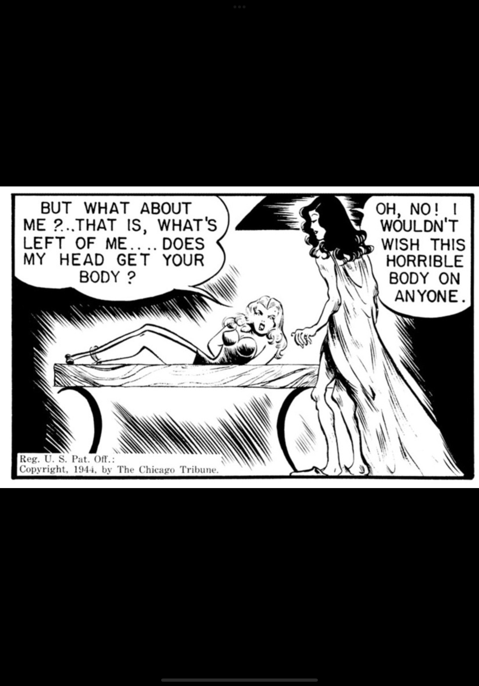 While Messick’s fan mail skewed heavily female, she was well aware of her heroine’s crossover appeal. The strip was preoccupied with Brenda’s increasing glamour and attractiveness. but at times, Messick went full cheesecake. In this early 40s Sunday below, Brenda bizarrely narrates an explainer of the recently concluded plot line as we ratchet through a gallery of teases.