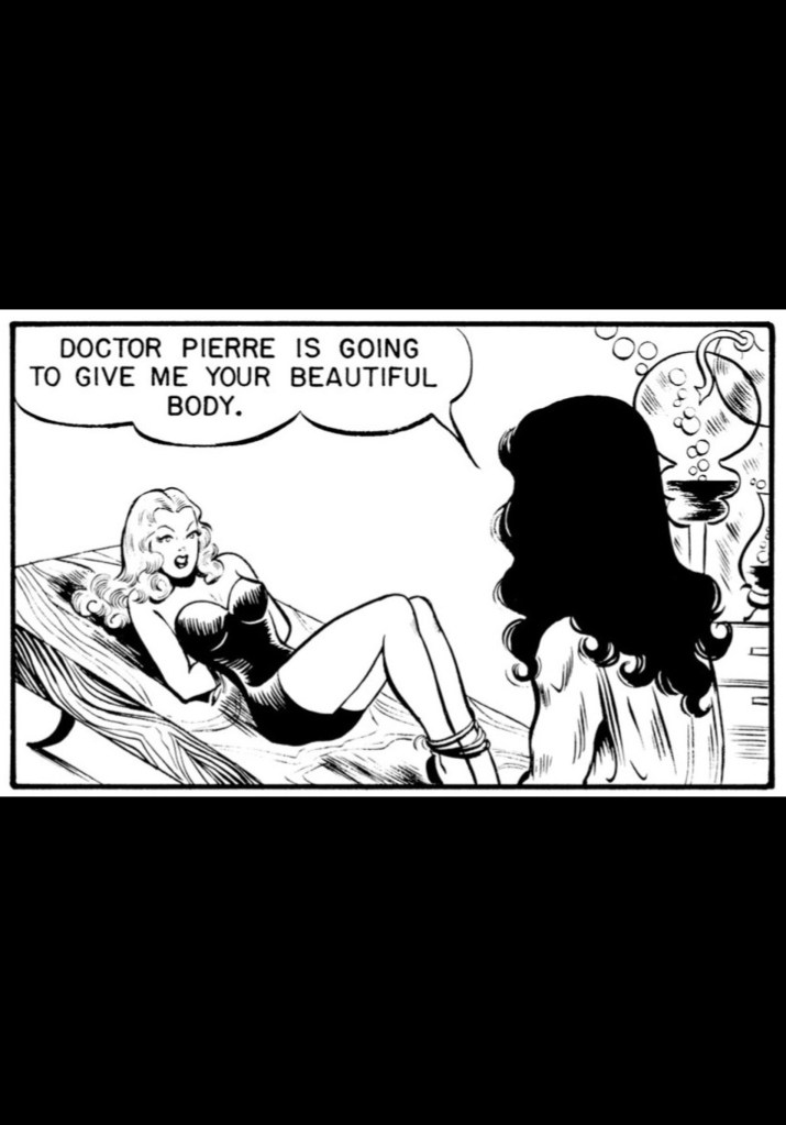 However pioneering Brenda’s careerism may have been, it would be a mistake to see Messick as a prescient feminist radical. Brenda’s heroism was still entrapped in cultural convention. A glamorized, idealized notion of feminine beauty still rules, and romancing the powerful (hopefully wealthy) ubermensch to match this vision is a primary goal for the strip. In fact, the first years of the strip seemed preoccupied with ideas around feminine beauty. In one of Messick’s early and strangest stories, two differently disfigured “Beastly” sisters fall under the sway of a mad doctor who intends to plunder Brenda’s body as parts to replace each sister’s withered pieces. The plot is wonderfully bonkers – a kind of camp that made Brenda Starr forever engaging. Lurking beneath the fun, however, are hints of Messick’s fixation with feminine repulsiveness and beauty. Brenda’s attractiveness is almost superhuman in the hold it has on others, a feminine version of the radical masculinity of pulp heroes. And Messick’s fixation with the beauty ideal, romantic fantasy and glamor often comes out in unforgiving views of everyone else.