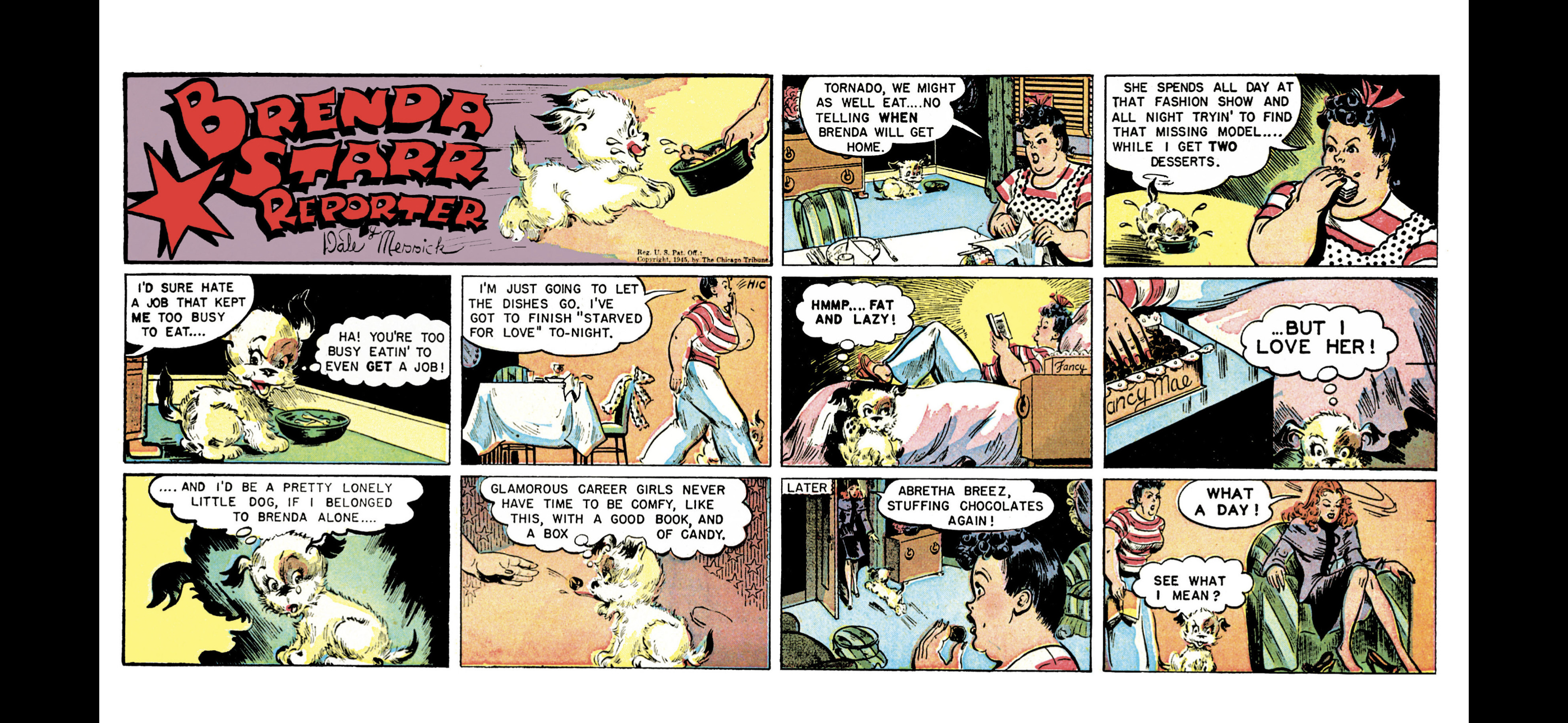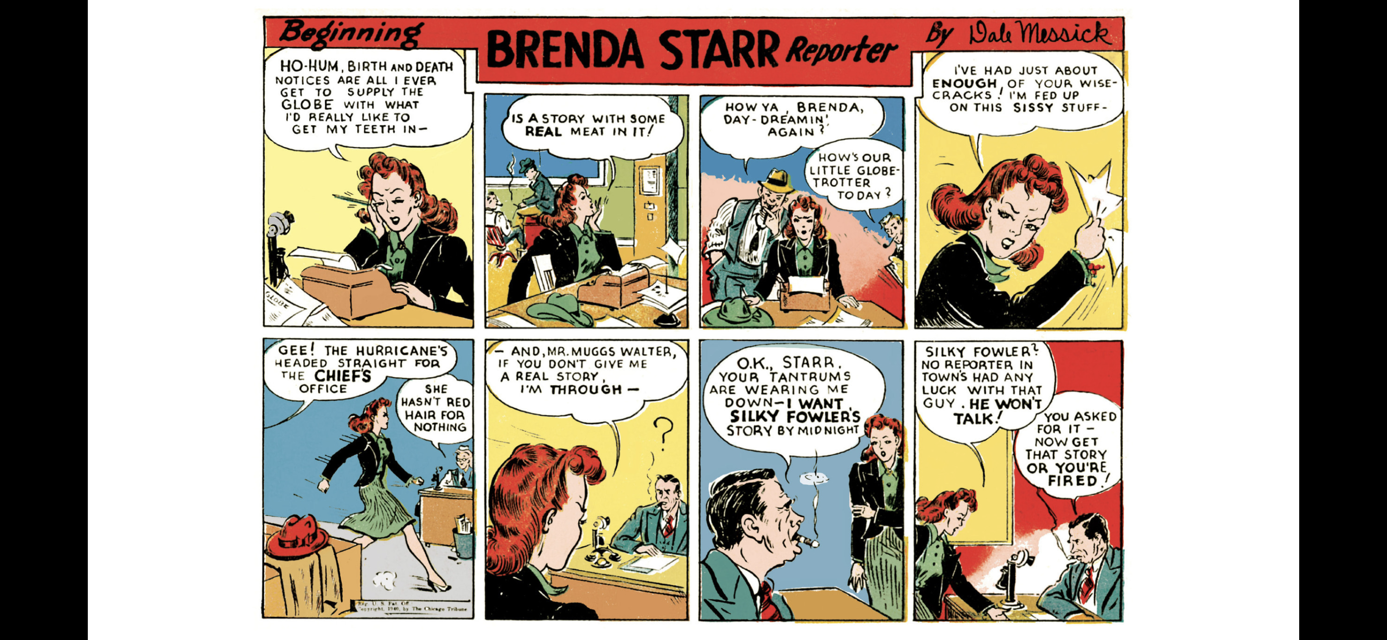 Like its eponymous heroine, Dale Messick’s Brenda Starr strip had to conquer the systemic sexism of the newsroom to make her mark. It launched in 1940 in constricted, Sunday-only syndication under the skeptical stewardship of New York Daily News legend Captain Joseph Patterson, after he had rejected Messick’s multiple submission for female-led adventure strips. According to lore, Patterson was unabashed in dismissing women in cartooning, claiming to have tried and failed with them in the past, “and wanted no more of them.” Messick’s samples were salvaged from the discard pile by Patterson’s more open minded assistant Mollie Slott, who helped the artist rework her ideas to feature an ambitious and dauntless female reporter. The artist was acutely aware of the gender deck stacked against her. Born “Dalia” Messick, she deliberately adopted the androgynous “Dale” to help get her strips considered more seriously. Slott convinced thge reluctant Patterson to give this red-headed firebrand and Rita Hayworth lookalike a try. History was made.