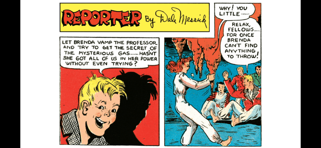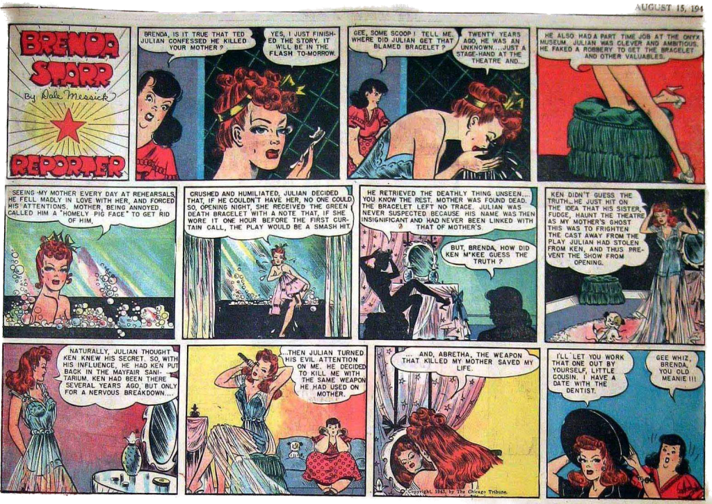 While Messick’s fan mail skewed heavily female, she was well aware of her heroine’s crossover appeal. The strip was preoccupied with Brenda’s increasing glamour and attractiveness. but at times, Messick went full cheesecake. In this early 40s Sunday below, Brenda bizarrely narrates an explainer of the recently concluded plot line as we ratchet through a gallery of teases.