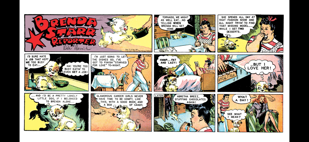 In fact, for a strip that famously broke a major gender barrier, Brenda Starr spends an inordinate amount of time policing the boundaries of traditional femininity. For instance, Messick uses good old fashioned fat-shaming to de-feminize Brenda’s other bestie, cousin Abretha Breeze. Abreatha is subjected to all forms of contempt for her weight, even from Brenda’s pup, tornado in the strip below.
