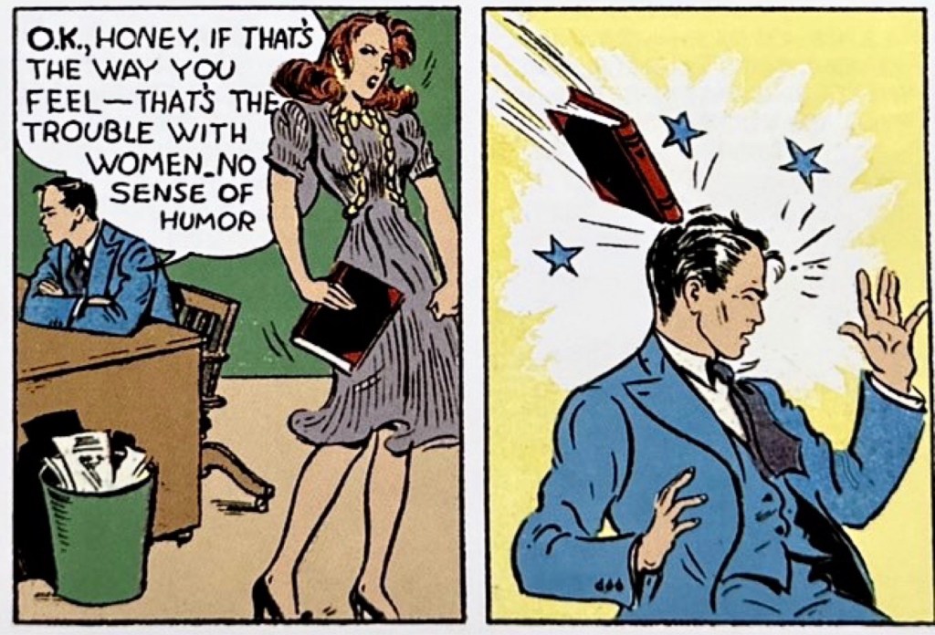 Women quickly embraced the strip, which not only had a strong heroine, but took a zany, imaginative path through a wide range of genres and offbeat characters, from murder mystery to romance, mad science to exotic international adventure. A daily strip was introduced in 1945, and Brenda Starr soon joined the pantheon of modern pop culture icons. Within the constraints of 1940s America, Brenda was closer to a feminist than one would have expected from the back pages of 1940s American newspapers. More than a hot head reporter determined to land a scoop, she literally took aim at the condescending men in her midst. In the first year of the strip, she was known for responding to sexist put-downs by tossing any found object at her co-workers’ noggins.