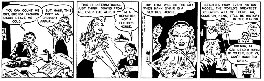 Which is not to say Messick and her strip transcended the very cultural stereotypes they seemed to be challenging on one level. Even in the first storyline in 1940, Brenda makes liberal use of her feminine tools, forcing a good cry to get a source’s sympathetic cooperation. While the men around her are often boyish or hapless, Brenda’s relationships with female colleagues like the rival Daphne can devolve quickly into mean girl sniping and even the occasional “catfight.” In fact, Brenda’s two genuine girlfriends are crafted out of sad tropes designed to highlight our heroine’s famous beauty and attractiveness. You could argue that her fellow reporter “Hank O’Hair” may be a refreshing early example of a thinly veiled lesbian comic strip character. But Messick throws every unfeminine butch trope she can get her hands on: masculine nickname, close cropped hair, side-slung cigarette in the lips, mannish suits and an allergic reaction to any “feminine” topic. Eventually Hank marries, of course, but apparently it came in response to readers’ trepidation. In a 1974 interview, Messick recounted that Hank was patterned after a reporter “I knew in New York, rather a masculine gal. But I got hundreds of letters saying people thought Hank was a lesbian and to keep her away from Brenda. I finally had to get her married and have a baby.” (cited in Caitlin, “Lovers, Enemies and Friends: The Complex And Coded Early History of Lesbian Comic Strip Characters,” Journal of Lesbian Studies, Vol. 22, No. 4).