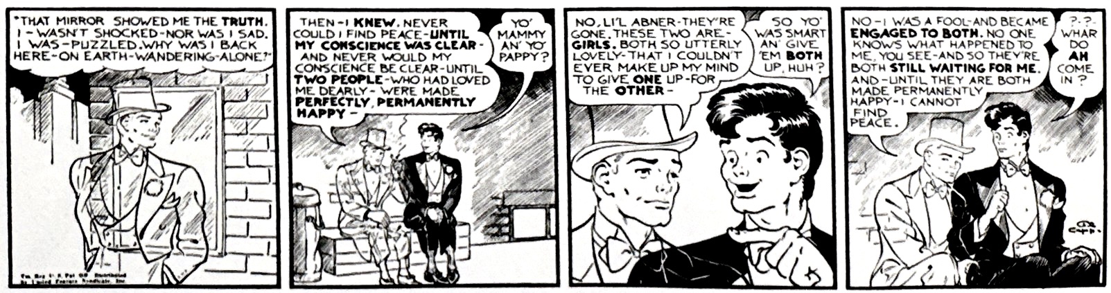 In his first attempts to bring pop culture tropes into Abner’s universe, Capp was not playing with genuine satire so much as alluding to familiar films, radio shows and novels. One of his first sustained parodies was a take on Thorne Smith’s Topper series, comic novels in which the ghosts of a roguish married couple of drunken socialites tries to liberate and loosen banking executive Topper. In Capp’s version a dapper spirit tries to find permanent peace by using Abner to make amends with two women the socialite had deceived. This sequence barely qualifies as cultural satire. It is more a bit of cultural referencing that would lead Capp over time into richer veins.