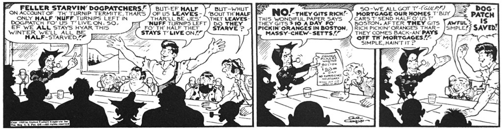 “The Grapes of Abner” episode in 1940 is also less a lampoon than a projection onto Dogpatch the basic situation of John Steinbeck’s enormously popular, Pulitzer Prize winning The Grapes of Wrath (1939) novel and subsequent film version. Just as the Joads and others fled the middle American Dust Bowl drought, Dogpatch’s turnip crop is hit by termites. While the Okies head west, lured by promises of fruit picking jobs, Dogpatch is conned into mortgaging their farms in order to pick a purported February crop of oranges in Boston. Like Steinbeck’s novel, this months-long trek north is a picaresque encounter with America, in-fighting by the hungry caravan, near-death experiences and the usual collection of Cappian cons and coincidences. In fact the Grapes of Abner conceit is a paper thin frame for business as usual in the strip. The sequence culminates in the Skraggs and Yokums feuding as a refighting of the Battle of Bunker Hill in Boston. Again, “The Grapes of Abner” is more allusive than satirical. But Capp is getting there.