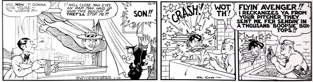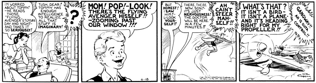 It is in his 1941 send-up of the still-new costumed superheroes that Capp hits a rhythm and depth for sustained satire. Only two years after the first appearance of Superman in print, the explosion of costumed, ridiculously super-powered heroes had already invaded comic books, radio and serial film. But Capp was among the first to poke at the overt silliness of these characters and detect the infantile fantasy driving the genre. Abner is recruited by panicked radio execs who are trying to conceal from a live audience that the voice of their he-man broadcast hero The Flying Avenger is played by a bespectacled pint-sized nebbish. When a swami in the adjoining radio studio casts a levitation spell on the Avenger, our stand-in becomes a genuine flying Abner “Ah cain’t steer mahself!”). In a compact satire that reaches across several weeks, Capp has his way with the goofy conventions and even dumber unanswered questions the genre poses. That the superhero fantasy is grounded in embarrassing fantasies of overcompensation and power is so obvious to Capp he tosses it away at first glance. Likewise, the fact that the whole point of the enterprise is driven by a sponsor aligning superpowers with eating “Boopsie Cereal” is just part of the background noise. He has more fun with the basic social challenges of someone free to fly around bedroom windows, (and so surveil) couples in bed or rooftop sunbathers. And of course there is the bone-headed vigilantism, which in this case recruits the hapless Abner into serving one side of a gang war. And then there is mastering the physics of flying.