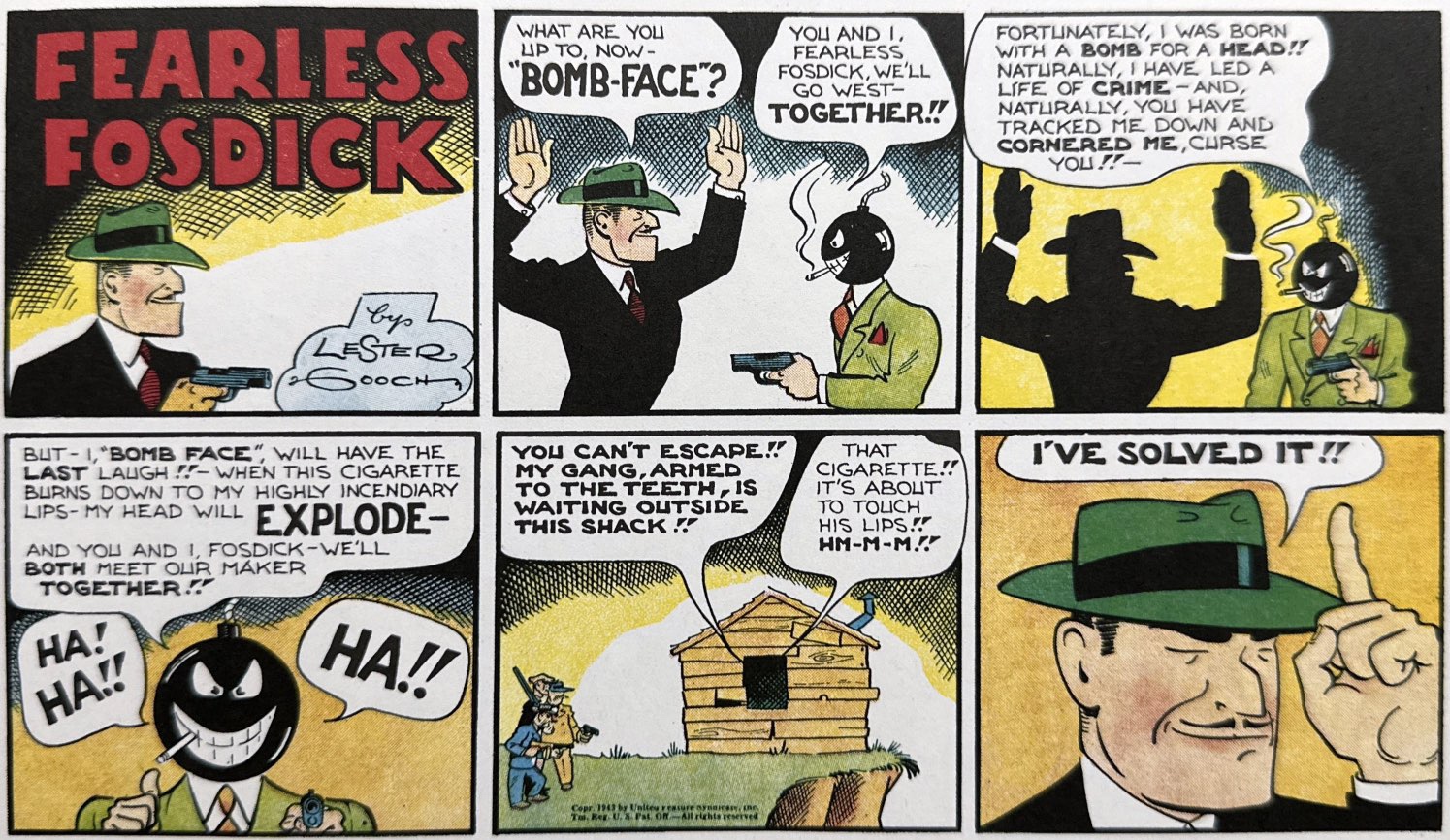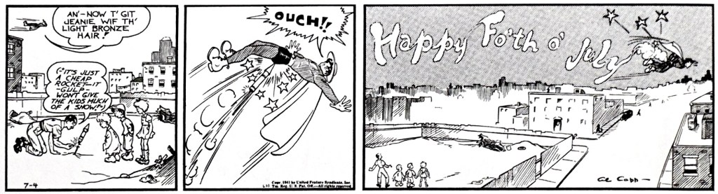 Wartime pop-culture proved fertile ground for some of Capp’s best sustained snideness. In August 1942 Fearless Fosdick made his first appearance. In this limited run, Capp poked at Chester Gould’s (aka “Lester Gooch”) famously improbable escapes for Dick Tracy. The bound Fosdick is dropped from a plane, leaving both readers and even Gooch clueless about how our hero will evade death this time. Capp may have been aware that this dig at Gould was not far from the truth. Gould admitted, at least later in life, that Dick Tracy was remarkably improvisational. He didn’t always know how he would get Dick out of some of the jams into which he drew him. For Al Capp, bad contrivance was part of the comedy in his strip. For Gould, it was part of Dick Tracy’s unintended weirdness.