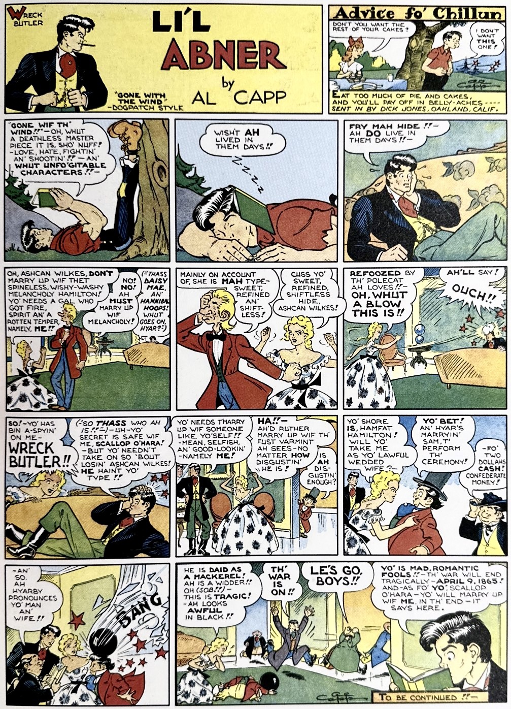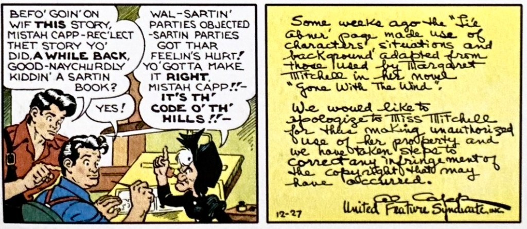 The one thing that “Gone Wif the Wind” demonstrated was that the Mitchell family had no sense of humor…none. The first Sunday installment of the story was met with the threat of a copyright infringement suit by Mitchell’s libel lawyer husband. He planned to ask for $1 in damages for every one of the 60 million+ newspapers in which Abner was published. Not only was the original satire arc shortened by the threat, but worse, the strip broke its fourth wall on Dec. 27, 1942 to issue a direct apology to Mitchel for unauthorized use of her intellectual property. It might be worth mentioning that John Steinbeck had a very different attitude towards Capp’s humor. Steinbeck, whose masterpiece Capp had burlesqued, wrote an effusive introduction to an Abner collection in the early 1950s. The Nobelist not only praised Capp as a great satirist but went further, calling the cartoonist one of our greatest living writers.