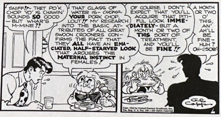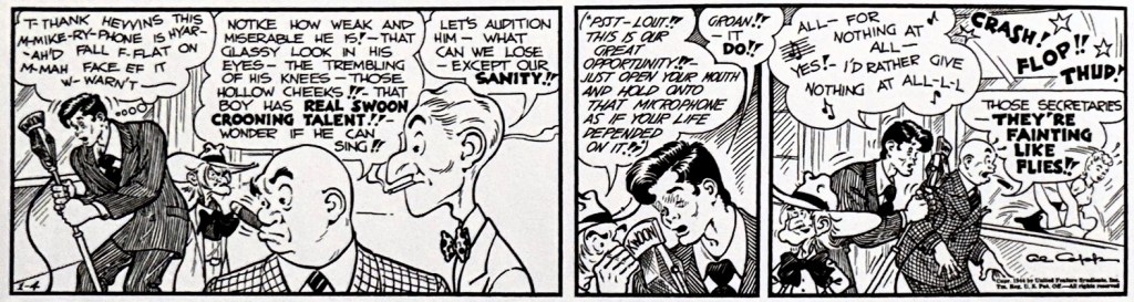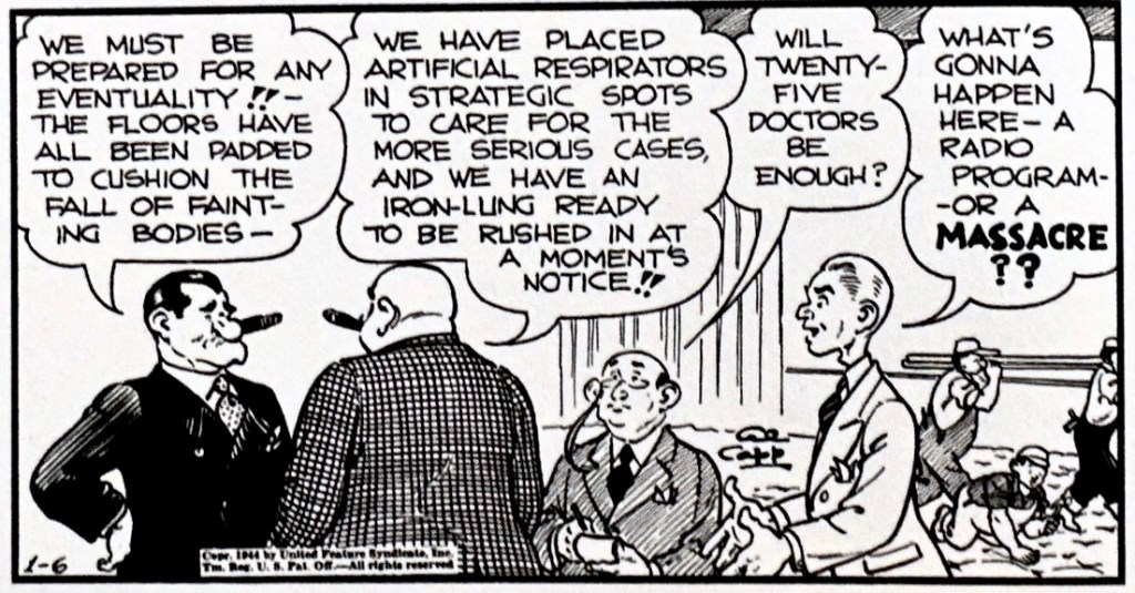 During the war years, Capp honed his satirical wit in taking on cultural trends, such as the rise of the teeny bopper and singing idols. His 1944 “Freddie McGurgle” episode is a nudge at the young Frank Sinatra’s meteoric rise. But more than that, he was lampooning a new kind of mass mediated fame and fandom. The screaming mobs of lovesick teen girls who later fueled the Elvis and Beatles phenomena in later decades began with Sinatra, who rose to record and radio fame as the Tommy Dorsey band’s lead crooner. Abner saves from suicide the despondent musical expert Concertino Constiato. He has scientifically determined precisely the kind of voice a “swoon crooner” needs to make teeny boppers faint, but he is hopelessly unattractive. Following the strip’s formula, a hapless Abner is recruited into someone else’s mad scheme, and he becomes Constiato’s puppet, a front man for the master’s swoon-inducing voice. Again following his “scientific” approach to marketing a modern crooner, Constiato names his discovery Freddie McGurgle and starves Abner to emaciation, yet another key to “swoon croon” success. Sinatra was famously skinny during the height of his 40s run. Freddie is an immediate radio hit, until of course the wheels fall off when Constiato fails to show up at a broadcast and the teen audience hears Abner’s real voice.
