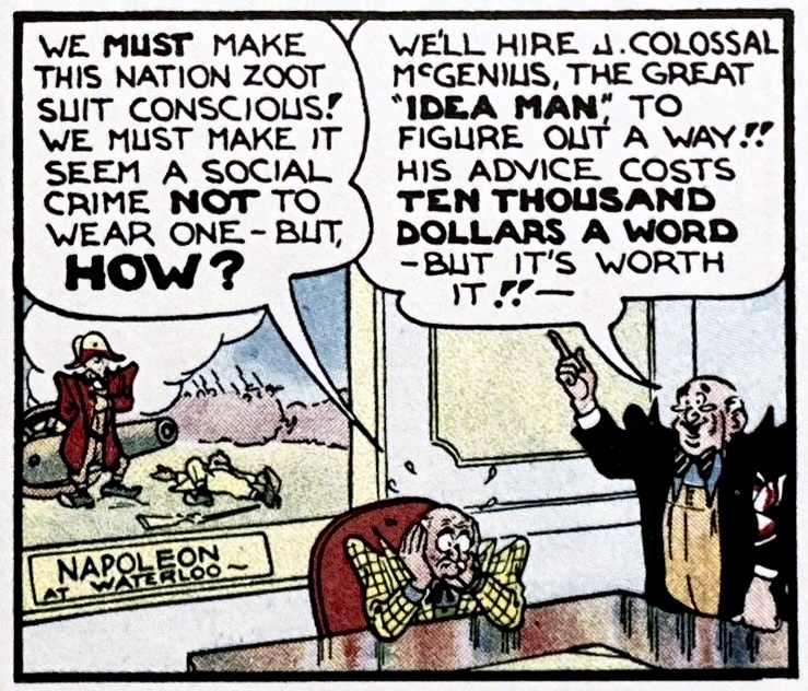 In Al Capp’s hands, the Zoot Suit craze was emptied of its ethnic aspects and made into a simple battle for market share between Zoot makers and the conservative clothiers. “We must make this nation Zoot Suit conscious,” barks a Zoot magnate. But that is not enough. A higher order of mass manipulation is needed. “We must make it seem a social crime not to wear one.” Costly “idea man” J. Colossal McGenius” advises them to create a national do-gooding “Zoot Suit Hero” to compel mass idolatry and Zoot Suit adoption.
