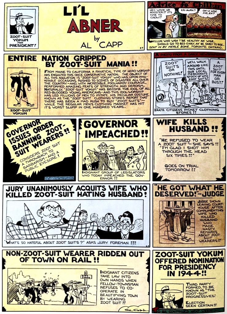 Capp’s richest satire of modern commercialism in the early 40s may have been his “Zoot-Suit Yokum” cycle in late 1944. The eccentrically shaped and boldly hued Zoot Suits were a fashion craze among urban Black and Latino men in the late 1930s and early 40s and soon were politicized by some segments of white American culture. The Zoot Suit style had massively padded shoulders, tight waisted and voluminous peg leg pants topped by a wildly wide brimmed hat. The trend became a point of pride in some communities, a way of rejecting drab urban workman dress. Aspects of the white mainstream, never at a loss for rationalizing racist contempt, pronounced the trend “unpatriotic” because it used considerable amounts of fabric during rationing-weary wartime. The controversy exploded in 1943 Los Angeles in the so-called “Zoot Suit Riots.” Groups of white servicemen decided to strip and assault Latino and Black Zoot Suit wearers.