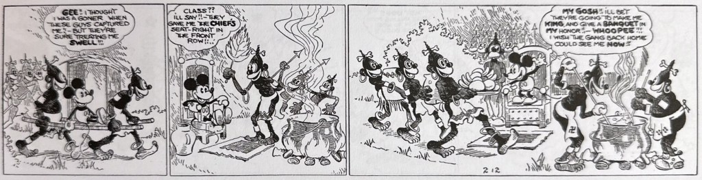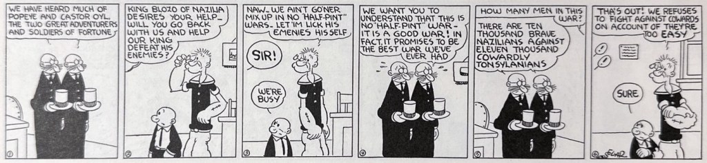 And whether on a journey to a fairy tale past or an adventure to an international present, cartoon monarchies were always fundamentally silly. They were inherently political fantasies about obviously undemocratic societies, but they were at the same time politically un-serious. They offered safe spaces to exercise vague, unfocused hostilities towards the rich, the powerful, social oligarchy, aristocratic hangers-on, sheepish “masses,” etc. The impulses and resentments were real, to be sure, and you can see them repeated in all areas of 1930s culture. But in these cartoon fiefdoms the politics are defanged by broad stereotyping and slapstick antics. And yet, some of the best cartoonists of the 1930s, namely E.C. Segar and Floyd Gottfredson, steered this screwball monarchy sub-genre into genuine social satire but in vastly different directions. Popeye’s attempt at leading a utopian Spinachova fails miserably under the weight of his own political incompetence and the mindlessness of the mob he tries to rule. It is a true lampoon of both power and the people. As we will see in the next post, Gottfredson’s Medioka scenario was an American exceptionalist fantasy. Mickey brings both democracy and a good dose of Midwestern common sense to a corrupt and bankrupt monarchy. Like all successful genres, the screwball monarchy was a container that could be filled in many ways and with different political perspectives.