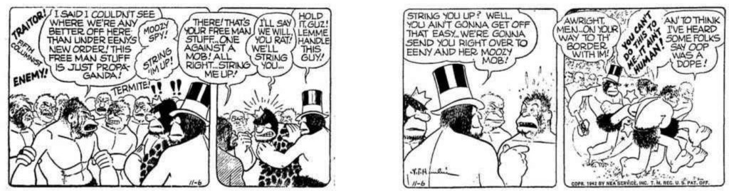 As an early proponent of America’s entry into the European conflict, Hamlin embraced the war effort and was sharply critical of American isolationists and others who seemed soft on fascism. In this episode, however, the focus is less on Eeny and the dynamics of dictatorship than it is on Moo’s domestic front and the threat of propaganda to undermine the resolve of Oop’s resistance fighters. The Moovian mob that had been an arm of Eeny’s thuggery now becomes an agent of positive conformity, policing unpatriotic attitudes. In a notably fair-minded move, Oop contains both his king and the crowd’s murderous response to the naysaying “traitor”. He redirects their violence toward simply exiling the dissident to live among the Moozys.