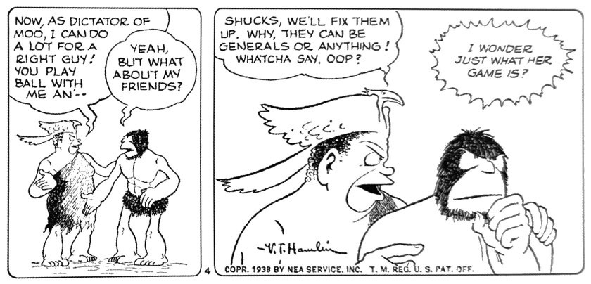 Unlike parts of contemporary Europe, prehistoric Moovians soon regret their dalliance with fascistic order. After a series of power plays and an assassination attempt on Alley, Oop and friend Foozy conspire to end Eeny’s reign by exploiting her phobia for rats. It is hard to believe that Hamlin’s reference to vermin is coincidental here. He was obviously plugged in to world news, and knew enough of Naziism’s rise to power to map a rough approximation onto his fictional Moo, including perhaps Hitler’s infamously anti-semitic references. The artist seems to take special relish in depicting Eeny’s terror in the April 12, 1938 daily that shows a thug losing her shit over a menacing Mickey-like mouse and a handful of fireflies. Hamlin’s energetic style peaks in this period. His use of expressive typefaces, blacks, pacing and animated explosion of Eeny’s terror, and the punchline panel all show a remarkable economy of form. It is a wonderfully satisfying revenge sequence that reduces Eeny and her fascistic ideology to its essence – cowardice disguised as a bullying thug.