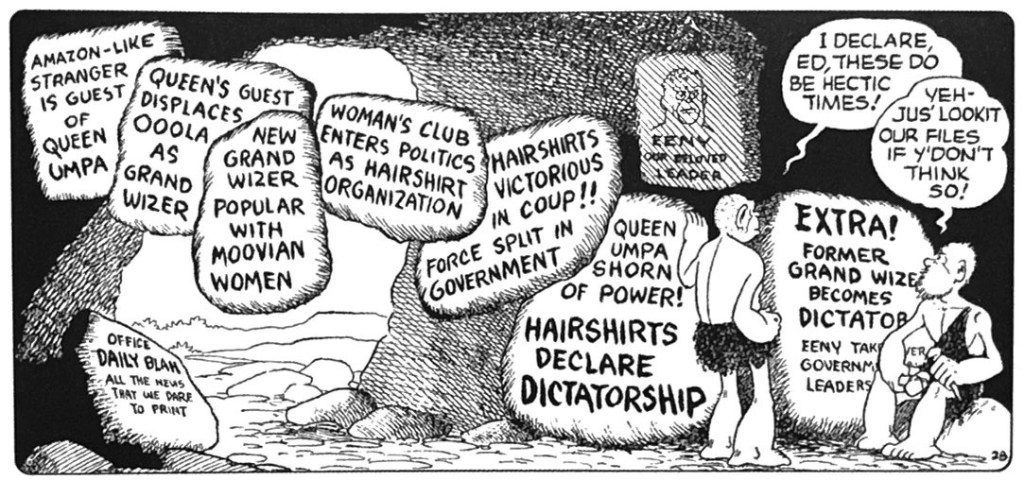 The saga begins with a dinosaur snatching Queen Umpa into the jungle where she meets this mysterious citizen of “Jerooly,” Eeny. The meeting may be more than coincidence. Soon after Eeny frees the queen, her designs on controlling Moo unfold. Channeling some of the cultural vibe of Depression-Era culture, Moo has turned decidedly matriarchal. Umpa took the crown when her tired husband opted for semi-retirement. She surrounded herself with a female court and advisors, including Alley’s perennial girlfriend Oola as “Grand Wizer.” Echoing Hitler’s rise to power as German Chancellor earlier in the 30’s, Eeny usurps Oola as the leader’s closest advisor and then turns the Queen into a mere figurehead for her own growing powers.