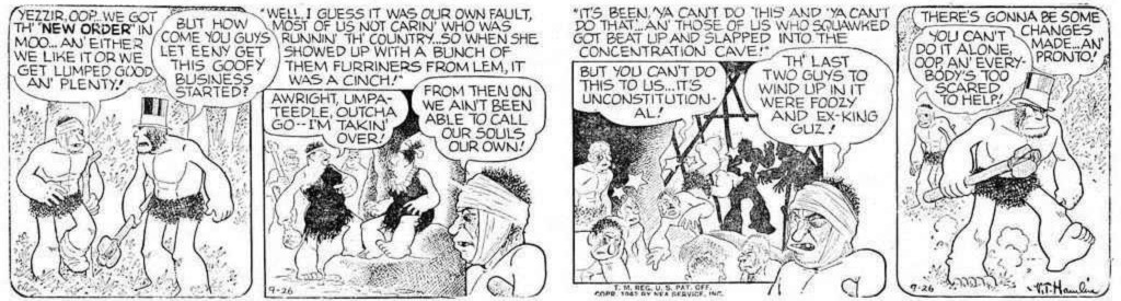 Eeny makes a wartime reappearance, however. Shortly after her first attempt to take over the Moovian monarchy, Oop and Oola are pulled into 1939 by Dr. Wonmug’s time machine. This radical pivot in the strip’s trajectory recasts Alley Oop forever after as an eon-hopping historical adventure hero. But in 1942, Oop time travels back to Moo, only to find Eeny has returned and exploited Moo’s political complacency. It is now a “Moozy New Order,” complete with a violently suppressed citizenry and “concentration caves.” “Well I guess it was our own fault,” explains a beaten Moovian. “Most of us not carin’ who was runnin’ the country.”