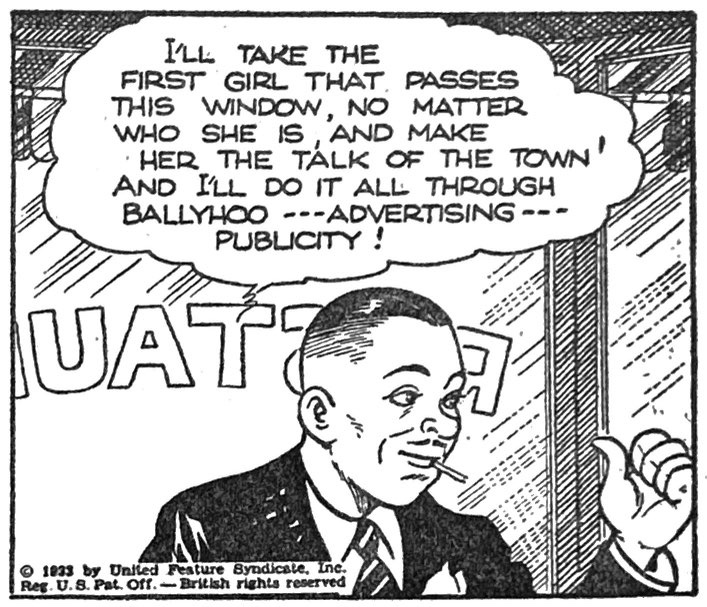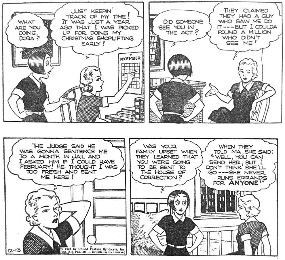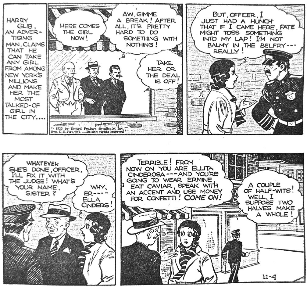 In a 1933 sequence, reprinted in book form in 1934, Ella experience rapid fire whiplashes in their fortune. She loses out on a generous gift from her own Daddy Warbucks, “Pa,’ gets mixed up with an ad-man’s hair-brained ballyhoo scheme, and even ends up in the slammer.