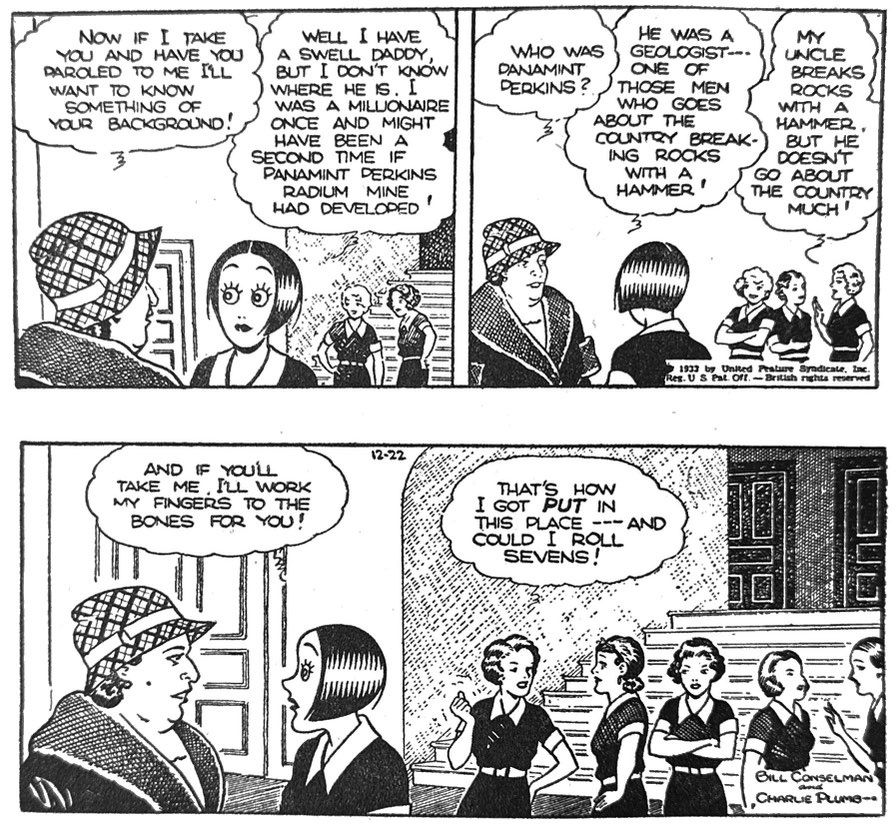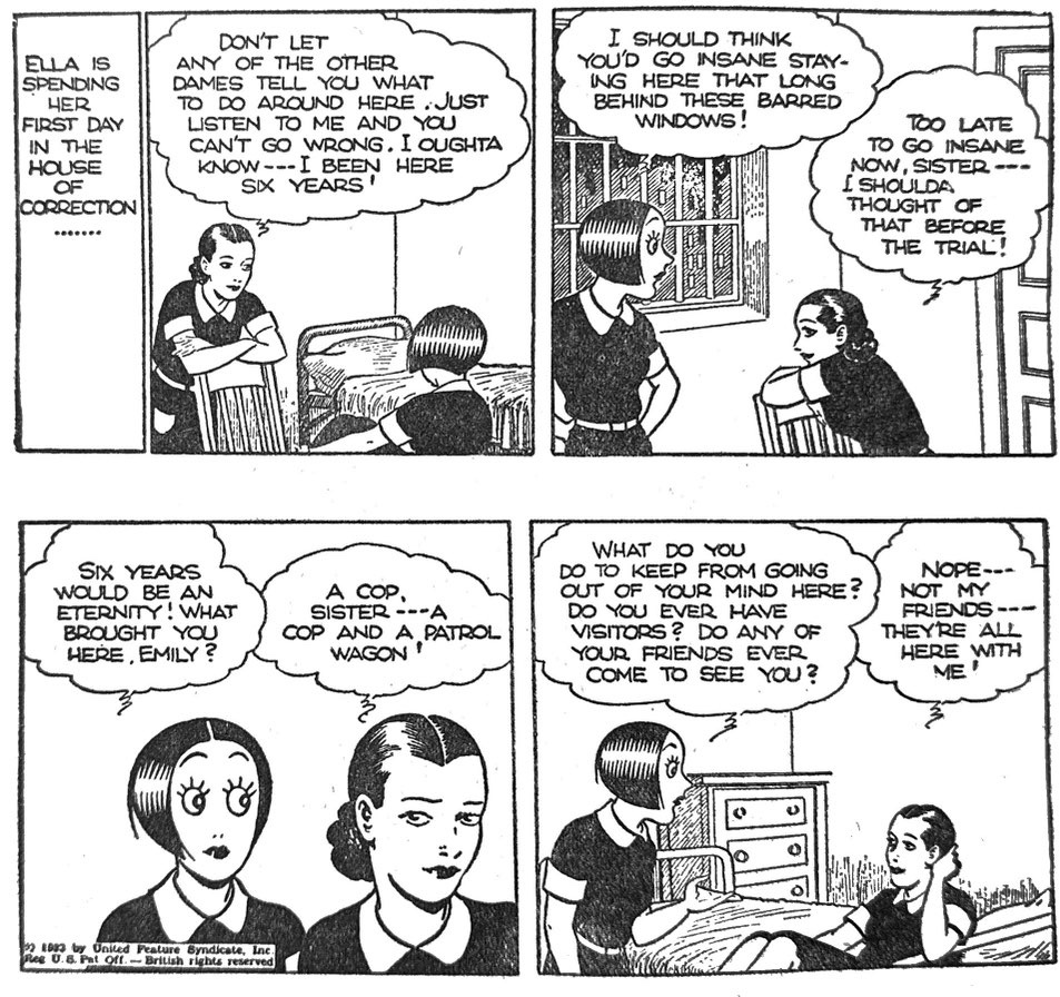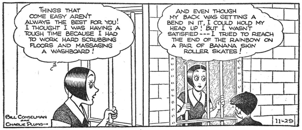 If Ella has an irritating flaw it is a cloying inferiority complex. She tends to internalize bad luck, finding ways to blame herself for misfortune. And yet, this is another place where writer Conselman psints this character with nuance and hues that are richer than most comic strip characters generally and women characters especially. But Ella’s short trip up the river is an especially interesting side trip into hard-boiled, tough-talking prison dames, another trope you don’t expect from your daily funny page. In just a couple of exchanges with inmates Emily and Dora Conselman uses just a couple of strokes to build portraits of defeat deflection. You could imagine Harold Gray tackling a similar topic, but across multiple weeks and hundreds of word of soliloquy, shaming and political finger pointing. The casualness of Conselman and Plumb’s treatment give it an artful impact…and sadness.